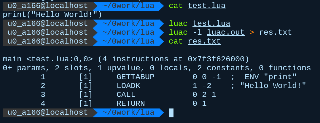 之前我们提到luac本质就是通过luaU_dump函数将Proto对象序列化然后存储。那么我们有必要分析ldump.c下的所有代码并编制相关反汇编代码吗?实际上lua自身就提供了反汇编代码在lundump.c里面,同时在命令行里可以加-l参数输出反汇编代码,如下我们写一个简单的例子
