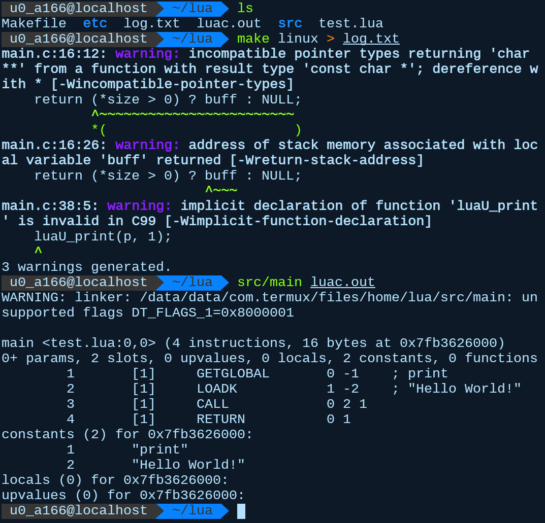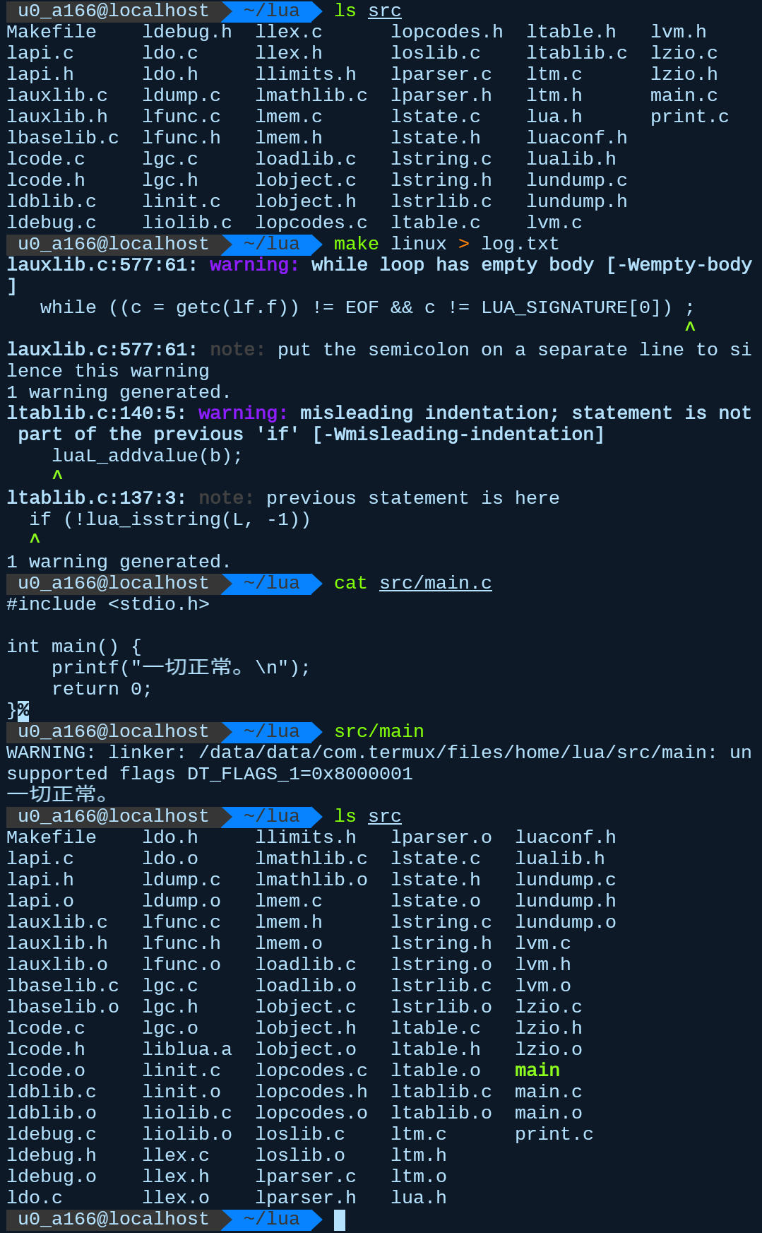 因为我们需要使用Proto结构体和luaU_undump函数,在lua嵌入开发中并没有提供,所以我们必需使用源码来构建我们的工程,拿到源码后,先删到没用的东西如lua.c和luac.c,再加入我们的main.c,同时修改Makefile文件,最后再编译,总览如下: