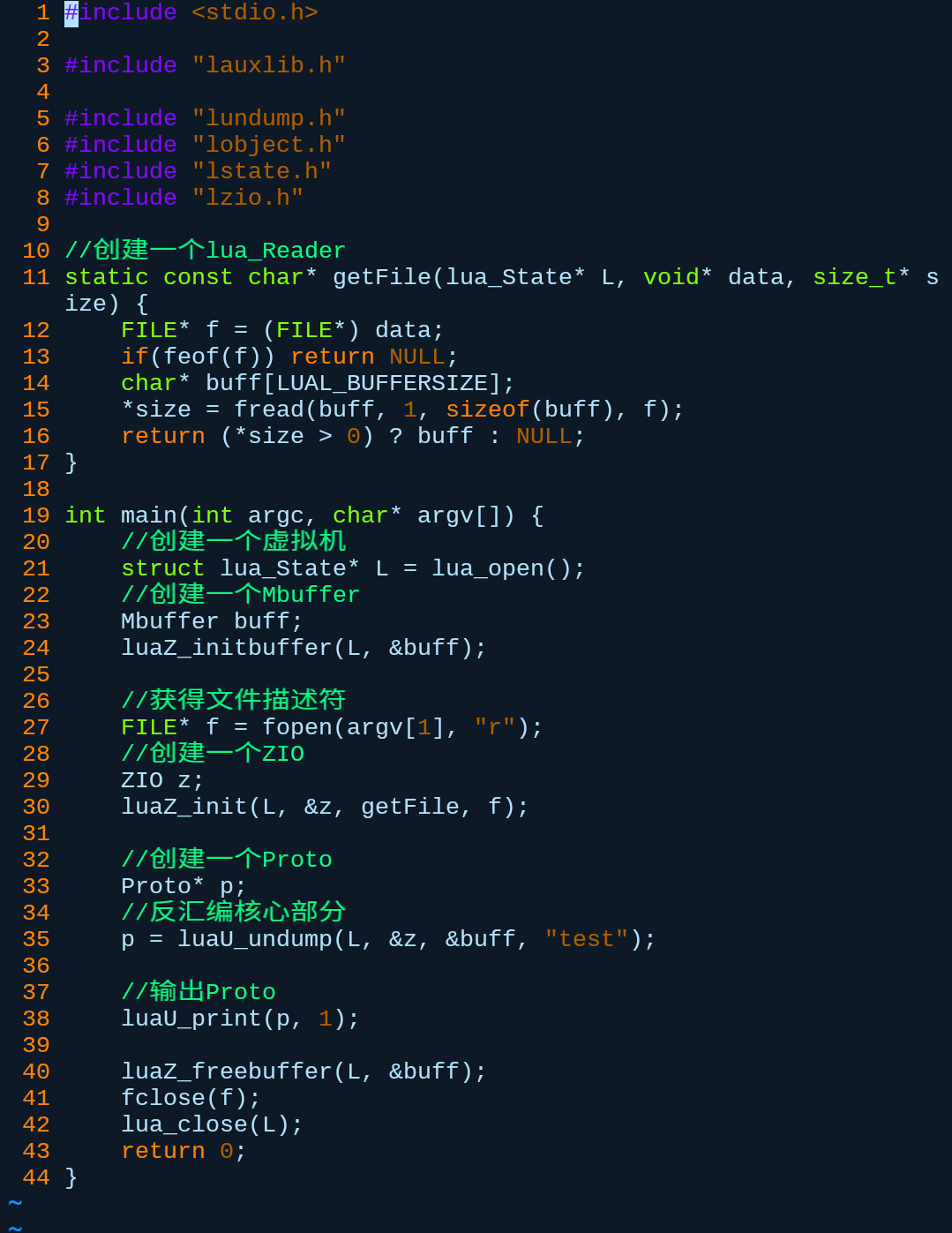 我们看到第七行,luaU_undump即是反汇编函数,luaY_parser则是用来解释脚本的函数。实际上我们是不满足于此的,我们想要直接得到Proto并以我们喜欢的方式自由操纵,lua是开源软件,这有助于我们做到这样的事,接下来我们来实践一下。实际上,我们也可以分析luac序列化后的文件,以自己喜欢的方式读取,然后构造相应结构,但对我们来说太麻烦了,我们应该充分利用已有的东西。