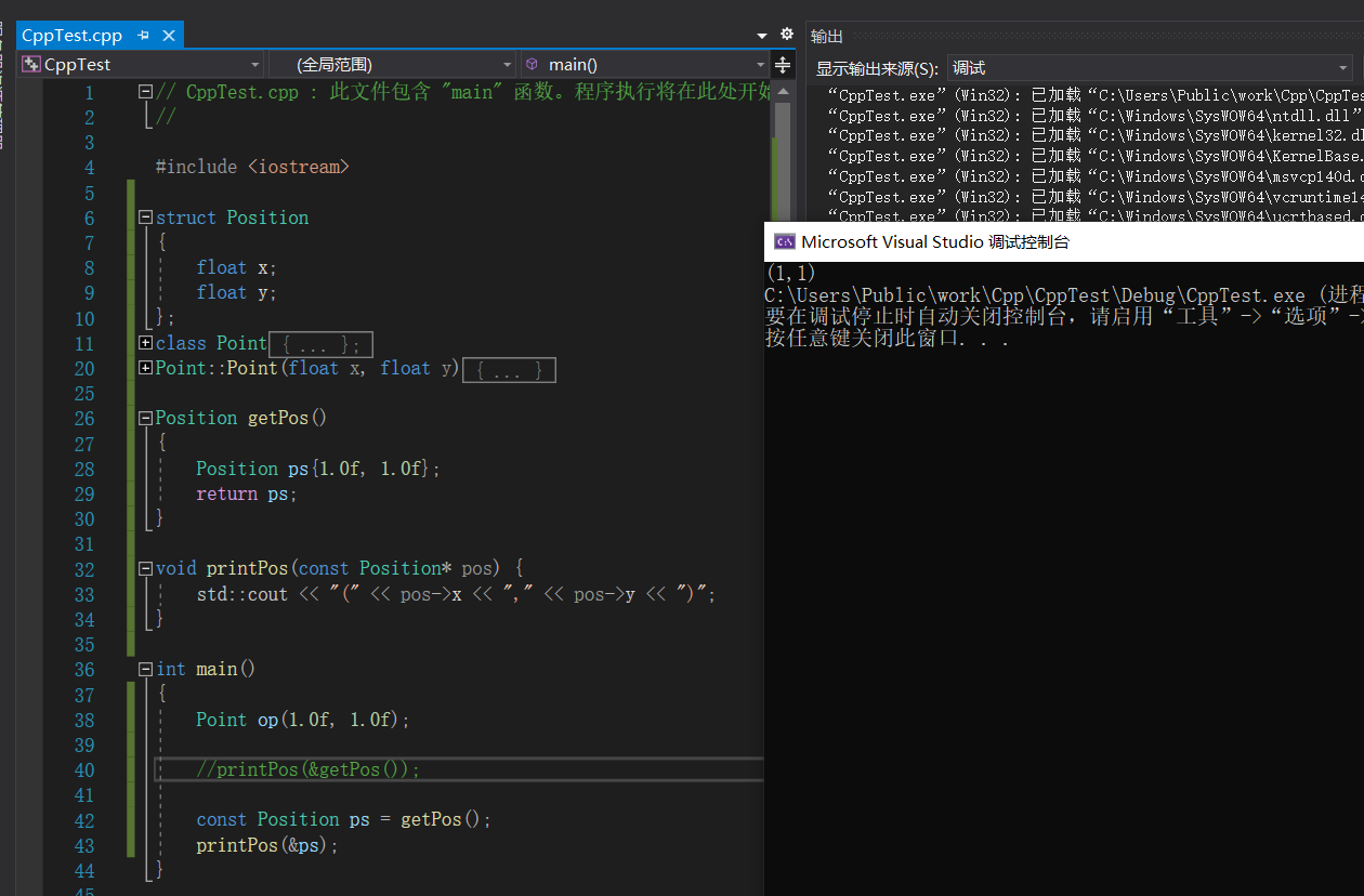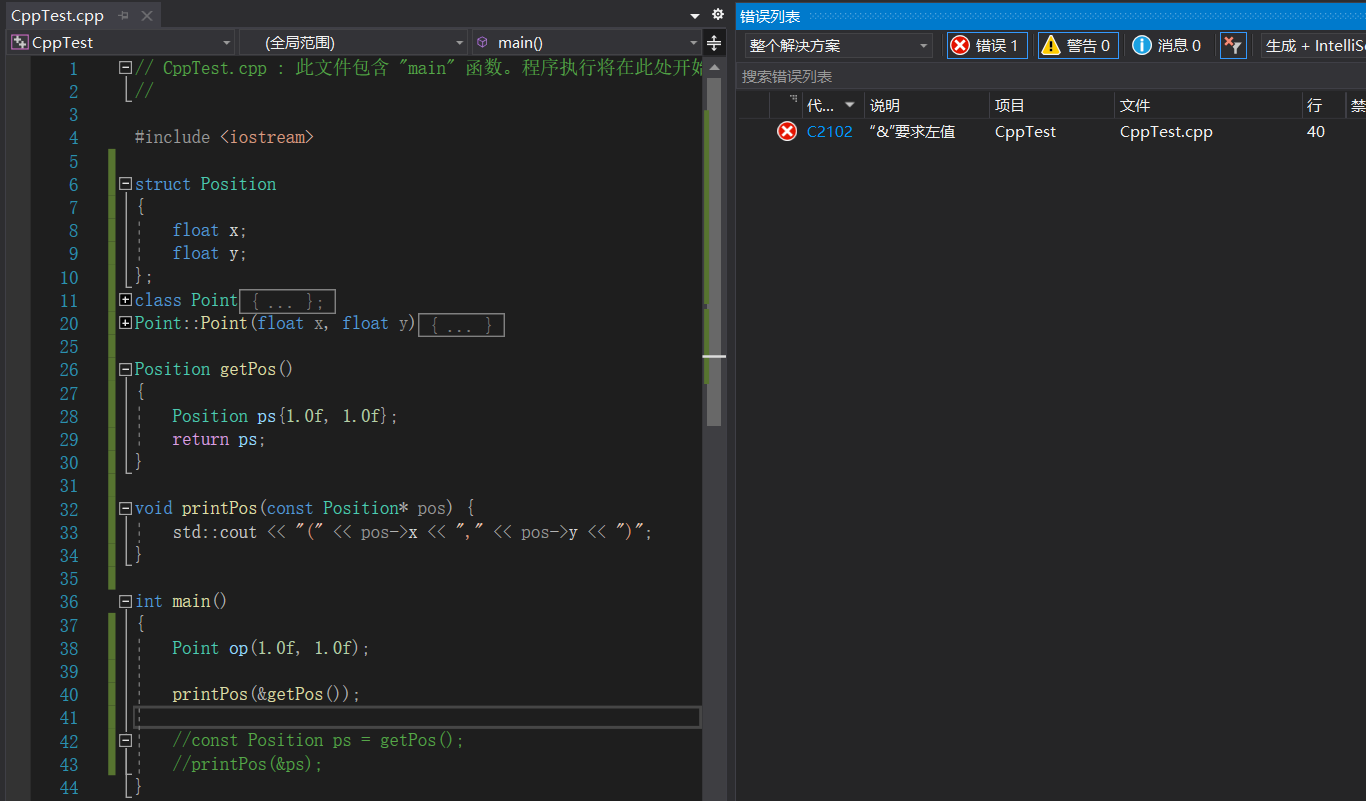 内容比较简单,就是一个函数返回一个结构体,我们将它返回值的引用传给另一个函数来输出。我的环境是win10和vs2019,原来作者当然是没有报错的,而我这里报了“取地址操作必需作用于左值”。所谓“左值”指的是可以寻址的值,如果认为返回的值是一个结构体,那它确实应该是一个左值,因为它们之间传递的是引用。如果我稍微加一个缓存变量,如下