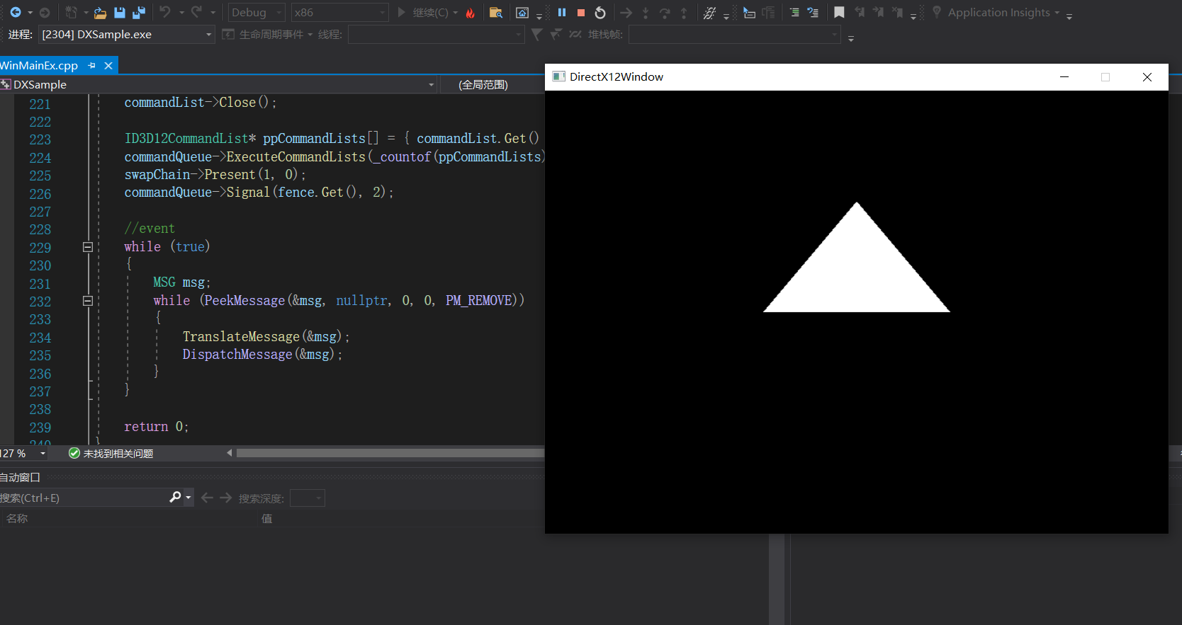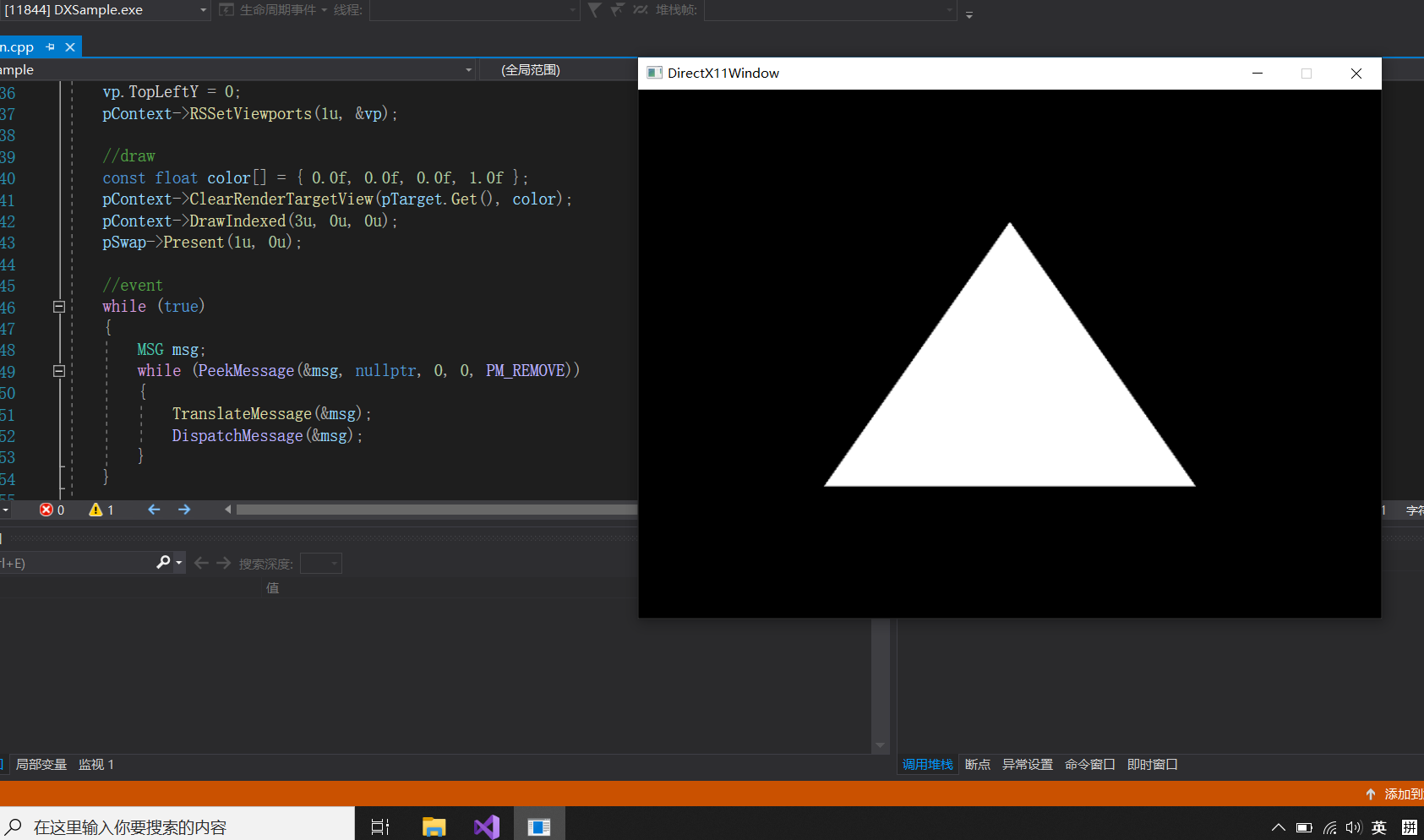 //draw uint32_t imageIndex = 0; vkWaitForFences(device, 1, &inFlightFences[0], VK_TRUE, UINT64_MAX); VkSubmitInfo submitInfo{}; submitInfo.sType = VK_STRUCTURE_TYPE_SUBMIT_INFO; VkSemaphore waitSemaphores[] = { imageAvailableSemaphores[0] }; VkPipelineStageFlags waitStages[] = { VK_PIPELINE_STAGE_COLOR_ATTACHMENT_OUTPUT_BIT }; submitInfo.waitSemaphoreCount = 1; submitInfo.pWaitSemaphores = waitSemaphores; submitInfo.pWaitDstStageMask = waitStages; submitInfo.commandBufferCount = 1; submitInfo.pCommandBuffers = &commandBuffers[0]; VkSemaphore signalSemaphores[] = { renderFinishedSemaphores[0] }; submitInfo.signalSemaphoreCount = 1; submitInfo.pSignalSemaphores = signalSemaphores; vkResetFences(device, 1, &inFlightFences[0]); vkQueueSubmit(graphicsQueue, 1, &submitInfo, inFlightFences[0]); VkPresentInfoKHR presentInfo{}; presentInfo.sType = VK_STRUCTURE_TYPE_PRESENT_INFO_KHR; presentInfo.waitSemaphoreCount = 1; presentInfo.pWaitSemaphores = signalSemaphores; VkSwapchainKHR swapChains[] = { swapChain }; presentInfo.swapchainCount = 1; presentInfo.pSwapchains = swapChains; presentInfo.pImageIndices = &imageIndex; vkQueuePresentKHR(presentQueue, &presentInfo); //event while (!glfwWindowShouldClose(window)) { glfwPollEvents(); }