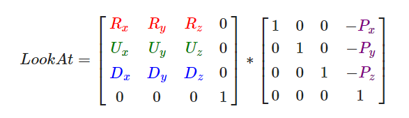 其中P是相机的位置,R、U、D分别表示右向量、上向量和朝向向量,它们可以组成一个正交标架,即坐标系,由线性代数的知识可以知道,只要像上面一样一排列,就可以实现世界坐标向相机坐标的转化了,而平常对相机的移动,可以通过位置向量加上相应的向量来实现,十分方便,如果要实现旋转的话,先看看这个项目