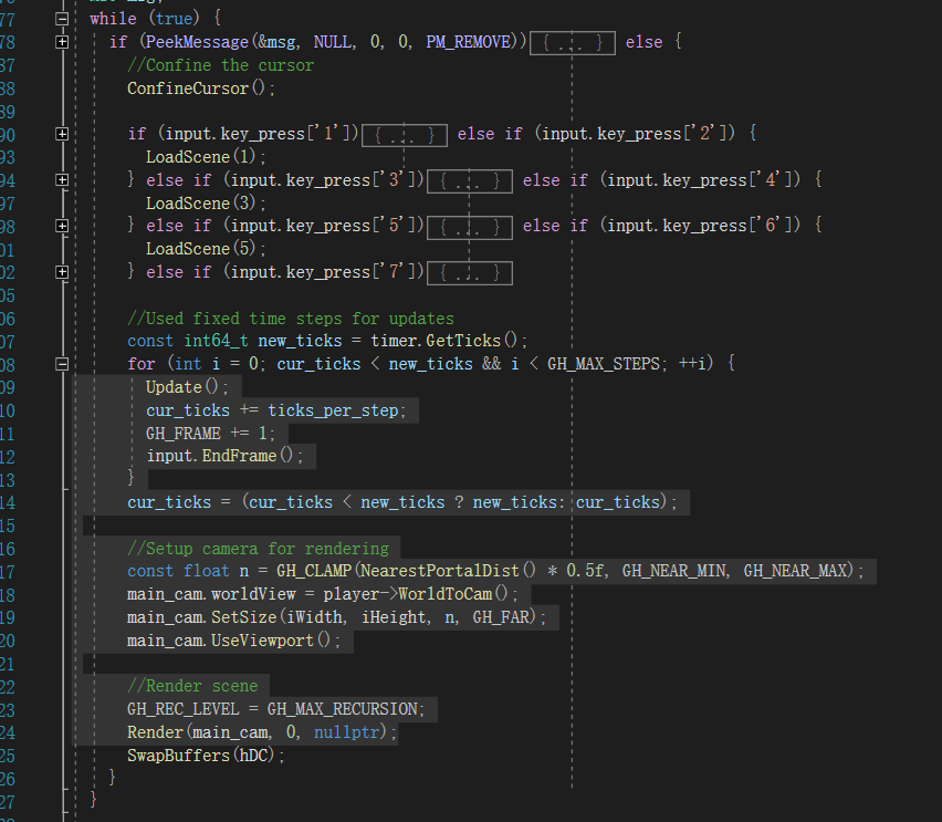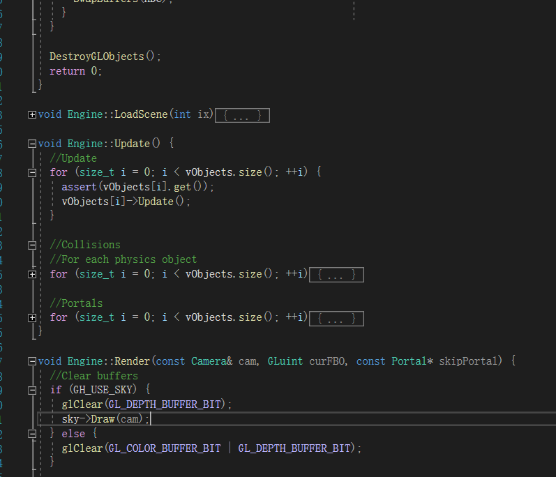 我们来详细讲讲它到底能做些什么,它是Object类的子类,Object是所有渲染对象的父类,提供了它们所需的共有属性,如位置、旋转和缩放,包括绘制,而Portal则拥有着独特的绘制函数,也因此使它成为了整个项目的核心。这里稍微提一下,这个项目的渲染循环,