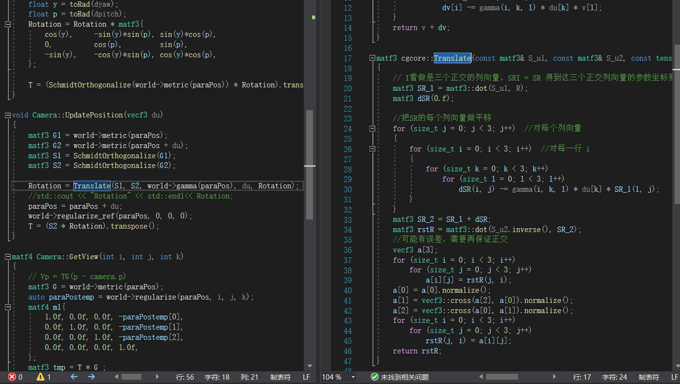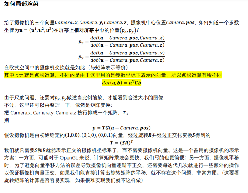 在UpdateDirection里面,我们看到一个矩阵Rotation,直接拿出来就可以实现我们平常的旋转了。而在这个项目了,我们发现,与Object类似,相机也同样是在旋转部分乘上这点的S矩阵。而在这个项目中,视图矩阵并不是作者所展示的那样有三个部分,在上面的getView可以看到,最右边矩阵m1是相机位置,不过多进行了一个叫regulariaze的不明操作,这个等下讲,而m2显然不是作者图给出的那样,在getView中可以看到结果是T*G在3×3部分的转置,在UpdateDirection可以看到T是S矩阵与旋转矩阵R乘积后的转置,而S与G的差别只是是否进行了施密特正交化,化简后是G的转置乘R乘T,所以此项目视图矩阵的差别就是旋转矩阵进行了一次相和变换,而且两个矩阵还差了个正交化,下面是作者在另一篇文章中的设想