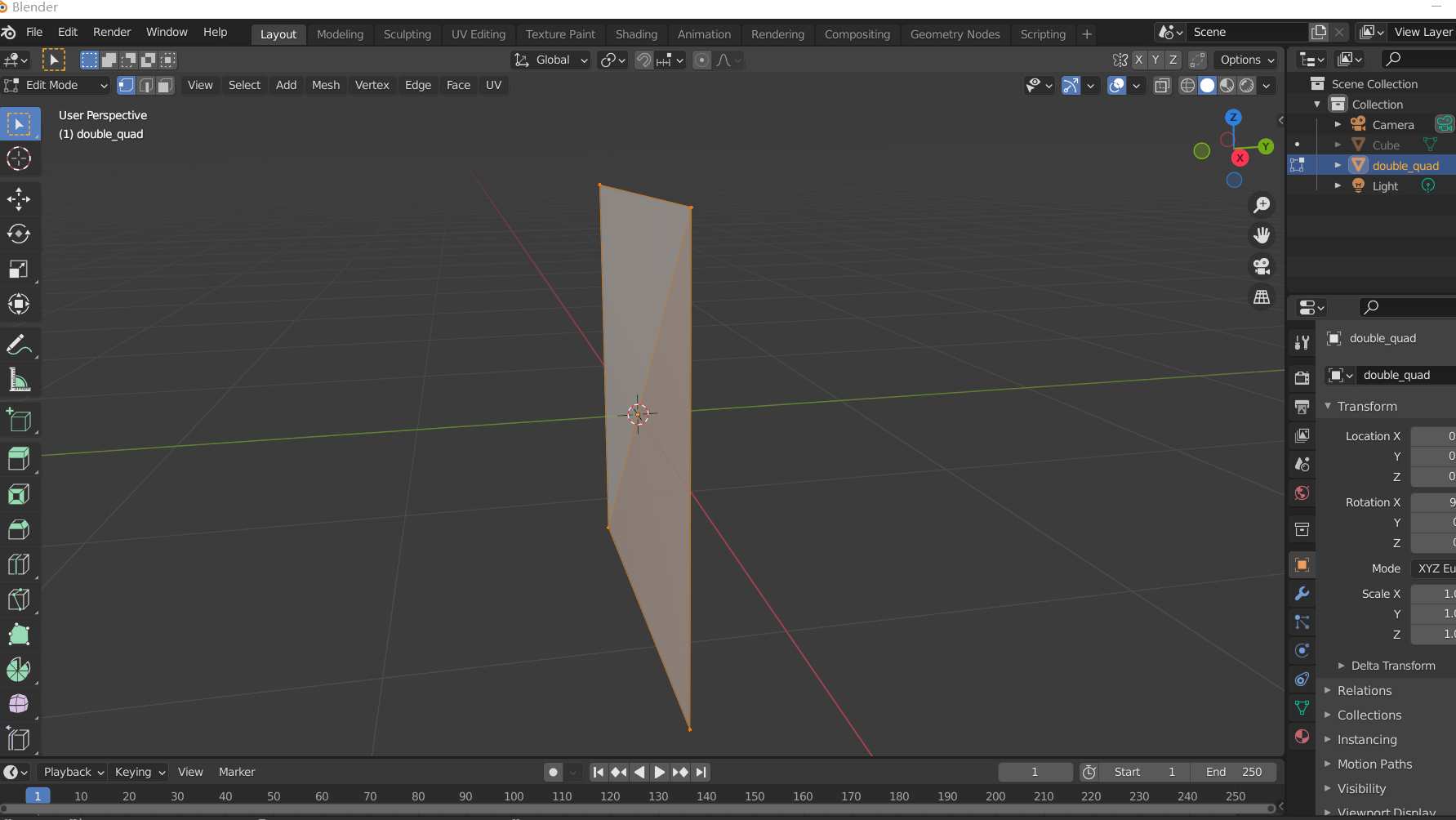 我们可以看到,它安排了两个Tunnel(隧道)和四个Portal。隧道可以设置两个Portal,两个Portal之间可以Connect,仔细看代码,我们可以发现隧道的两个Portal并没有连接,而是与另一个隧道的Portal连接。什么是连接(Connect),Portal又是什么,我们还是得看它的源码。Portal有两个面front和back,使用Warp进行封装,而Warp保存这个面的所指向的两个Portal,表示从哪里来又到哪里去。总的来说一个Portal可以连接两个Portal,分别放在两个面上,至于它对应的模型“double_quad.obj”,在blender里打开可以得到,