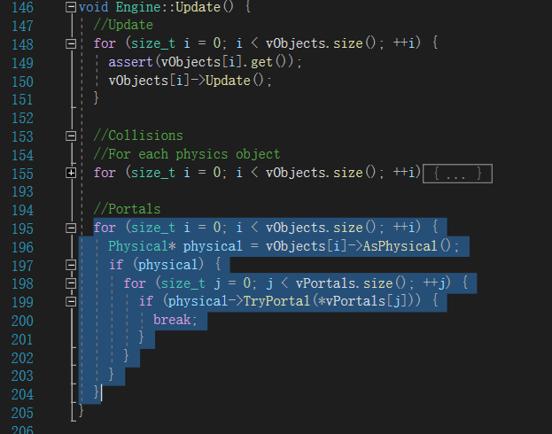 方法是比较常规的遍历,首先遍历所有的Object,前提它是Physical,目前只有玩家具有物理性,然后对每个Portal进行碰撞检测,不算优秀但也不差。到现在,我们也可以还原第一个场景到底做了些什么了,如下图