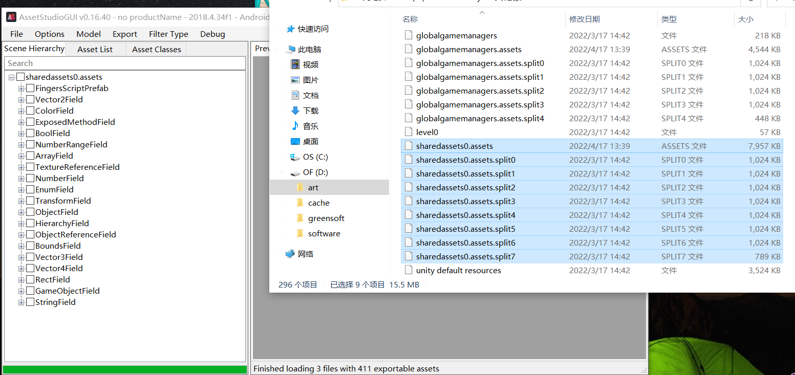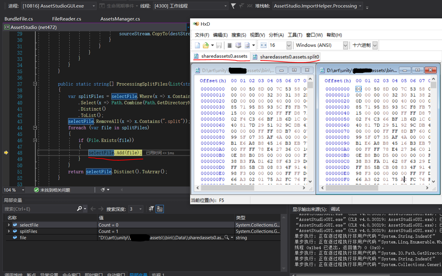 拿前面的例子,在调试过程中,我们发现sharedassets0.assets的前些部分与sharedassets0.assets.split0的二进制文件基本相同,更进一步发现sharedassets0.assets包含了.split的所有部分内容,也就是这个游戏里放了两部分相同的资源,但这其实是有理由的,没有split部分负责索引,有split的部分负责具体的读取,这样在游戏运行过程中可以加快资源的读取。