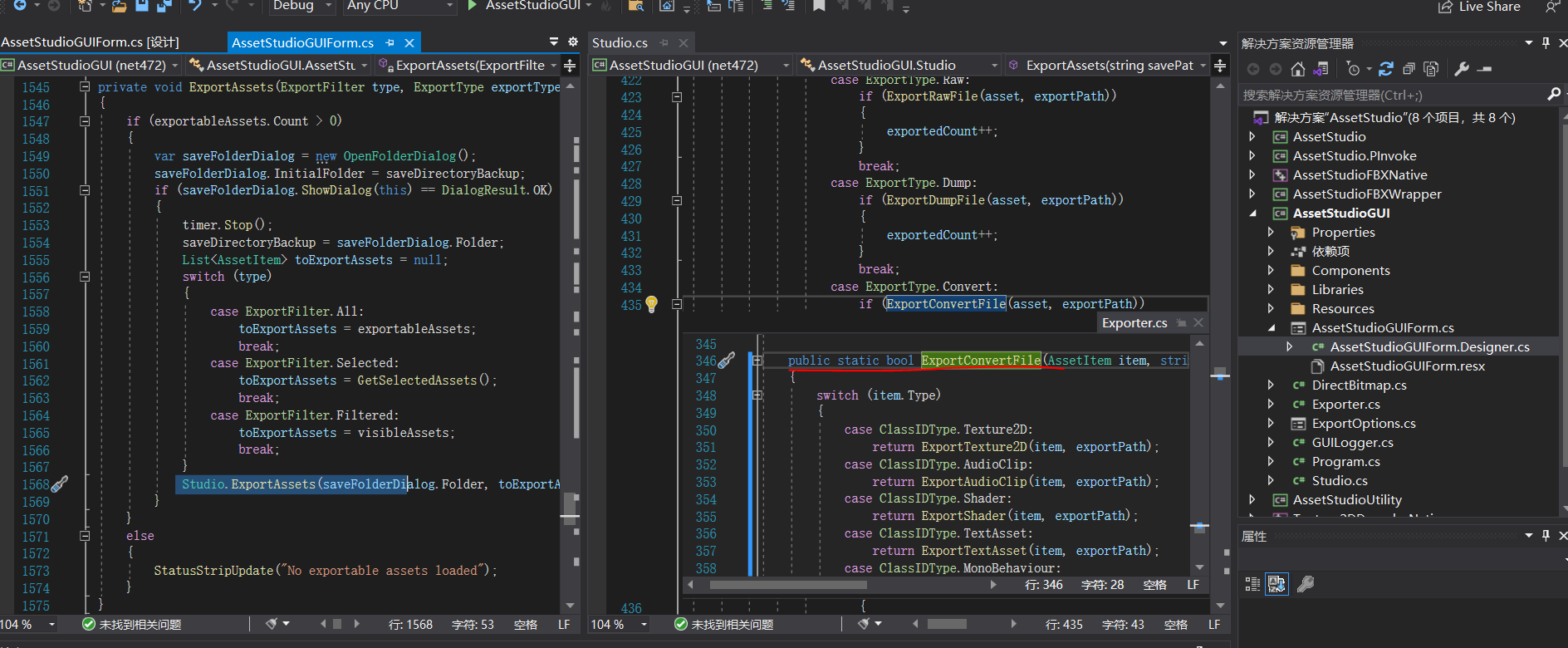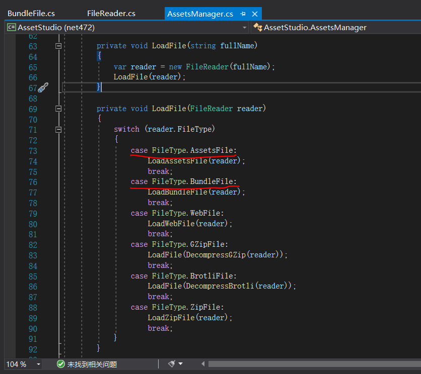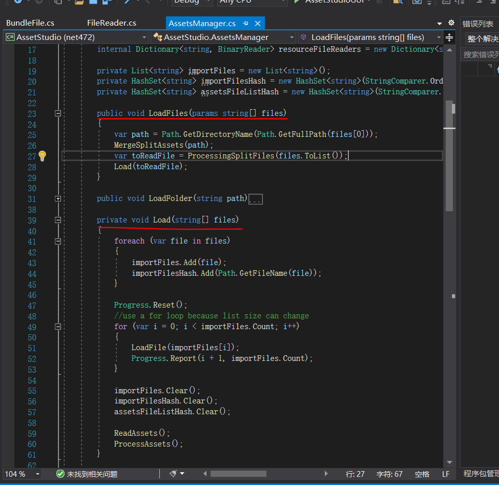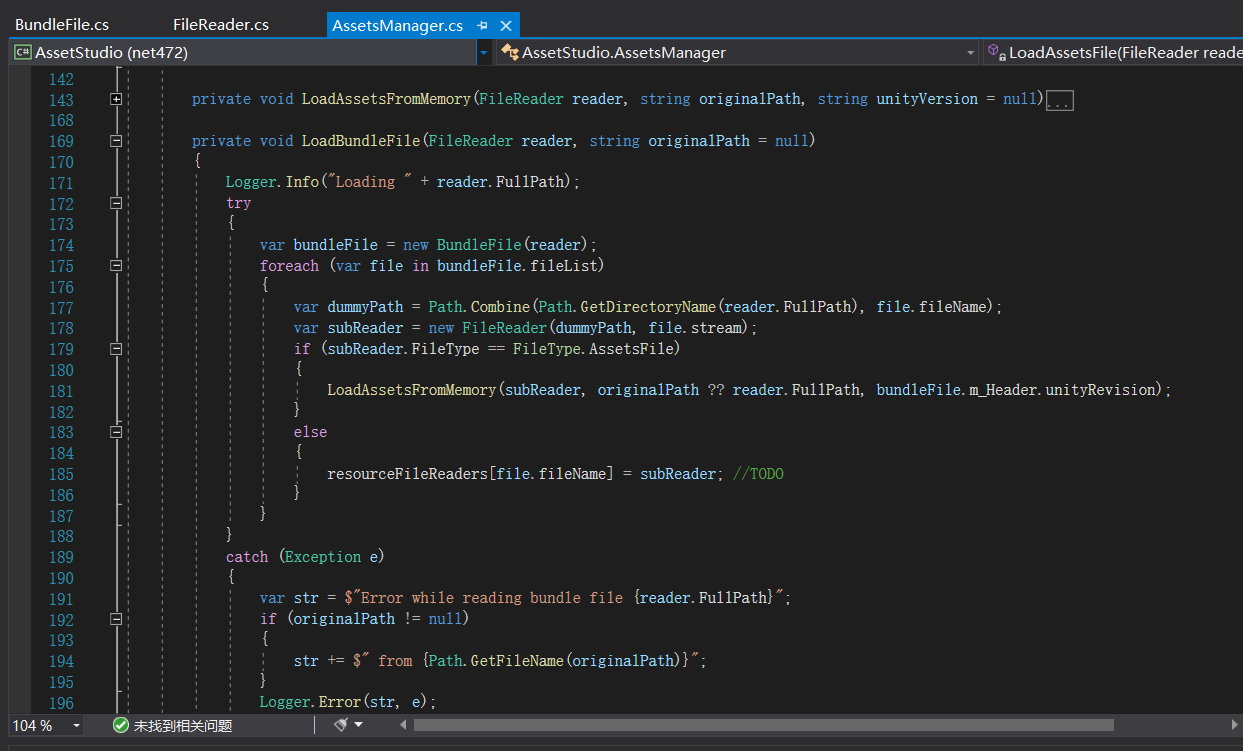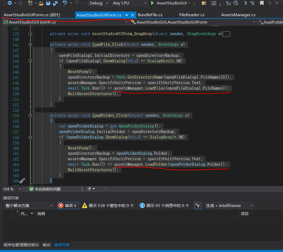 在项目“AssetStudioGUI”中,找到主界面文件“AssetStudioGUIForm.cs”,查看源代码,找到文件载入的源代码(先研究与Unity密切相关的此部分内容)