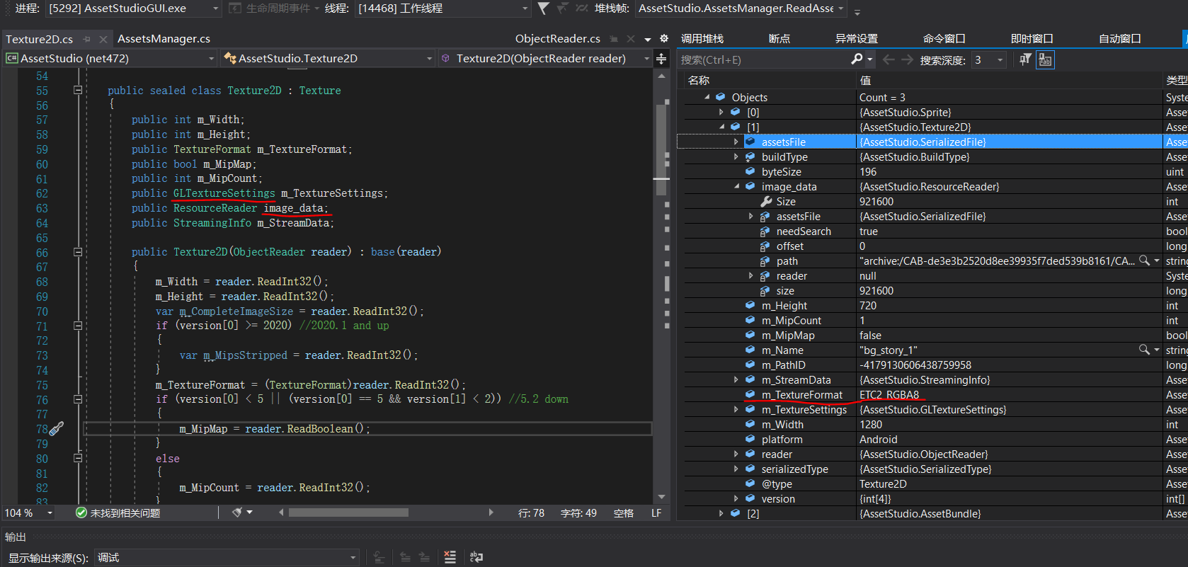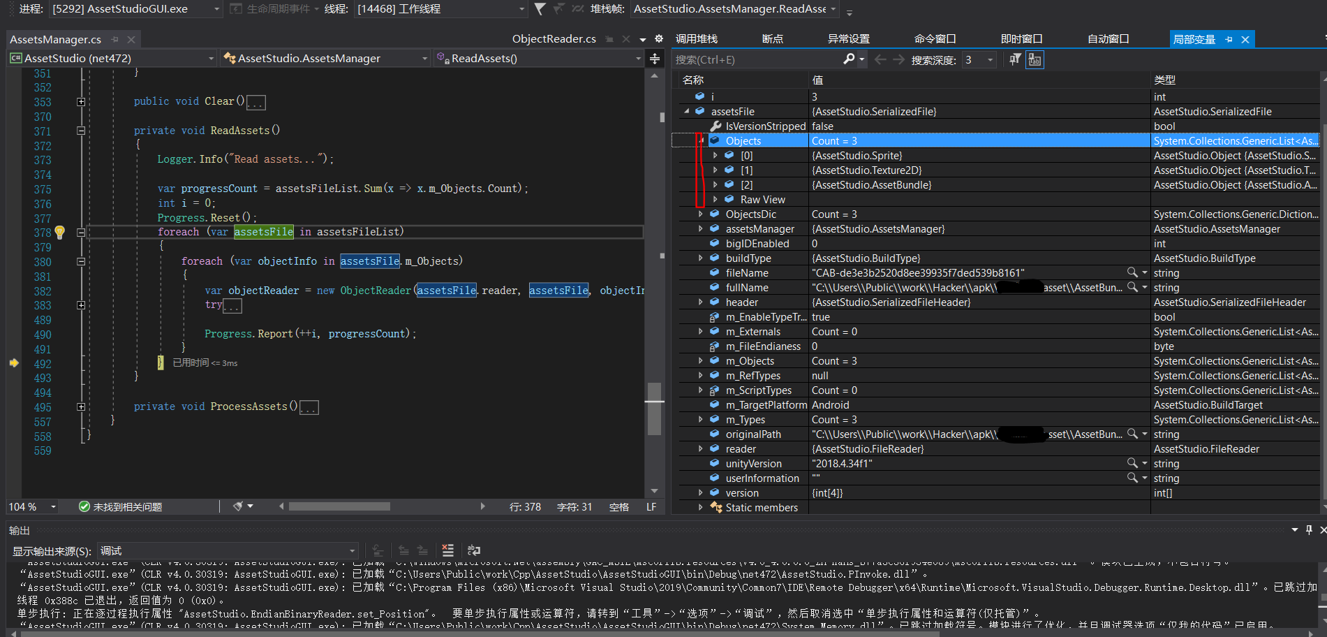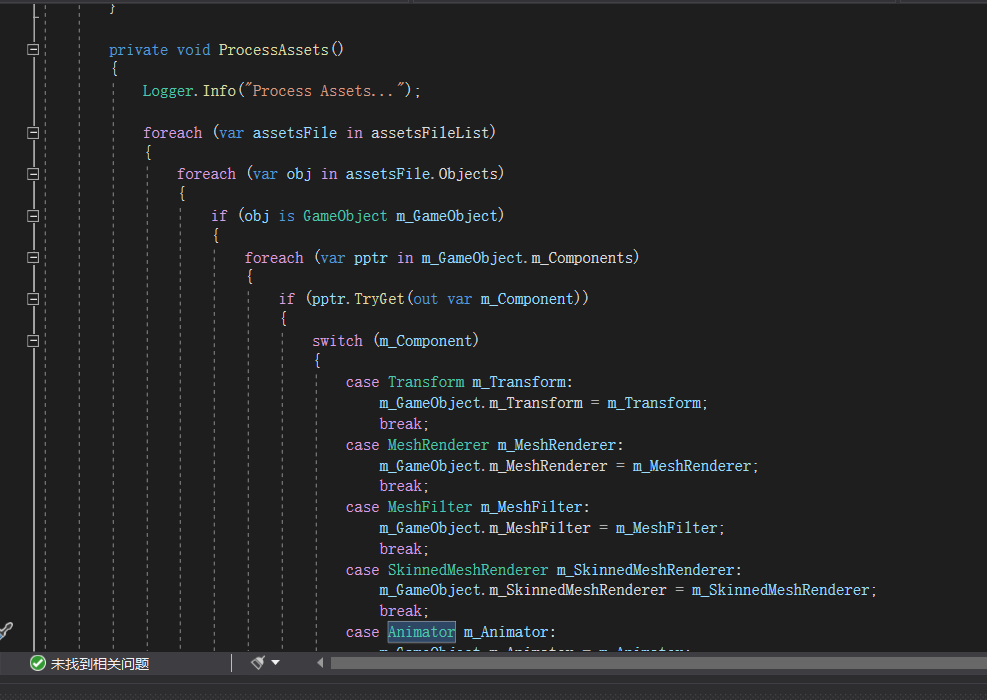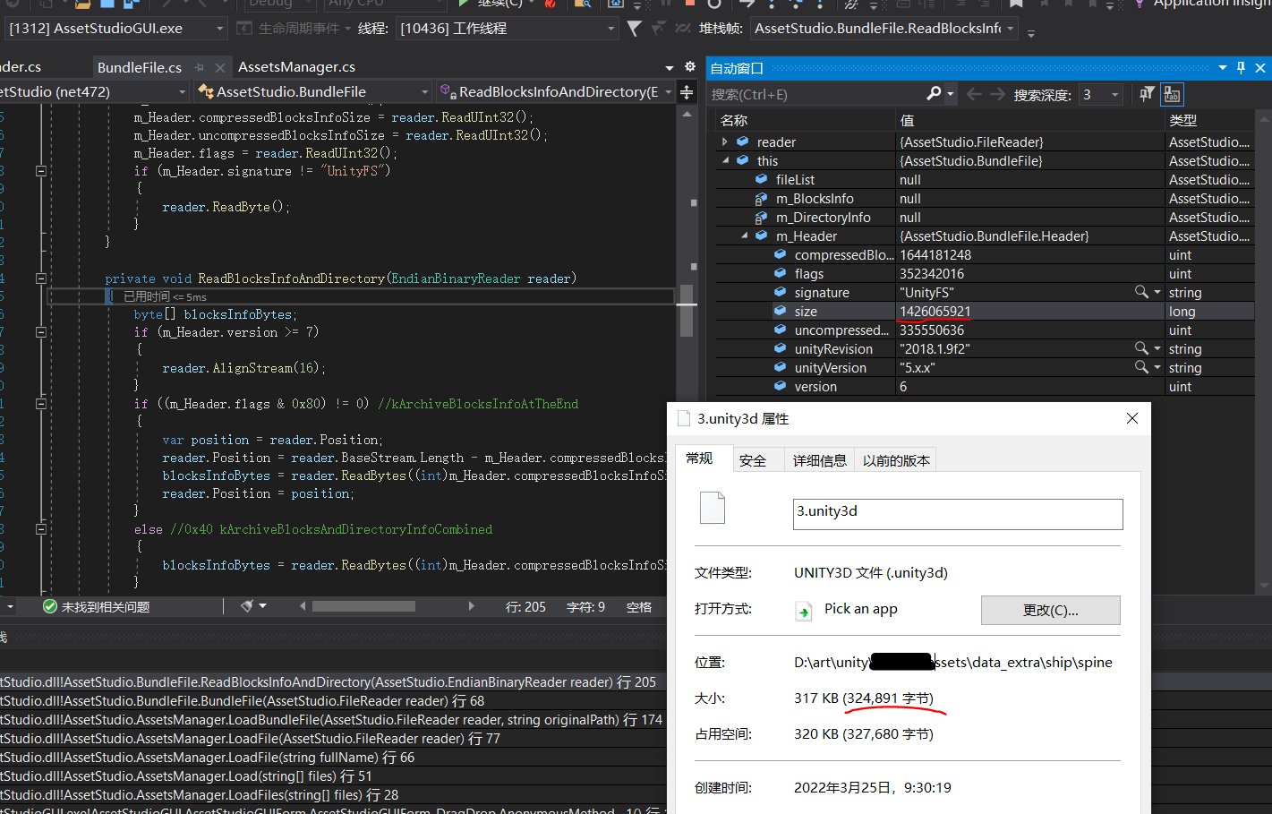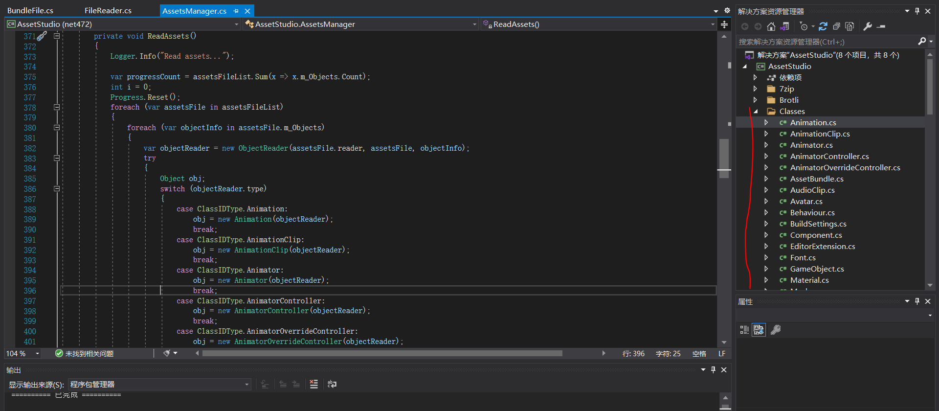这里的OpenFileDialog,上下两个稍有区别,上一个直接使用.netFramework的UI接口,下一个虽然稍微封装了一下,但功能差不多,反正最后得到用户所选的路径,在Task中,AssetsManager实现文件的载入和解析工作,最后的“BuildAssetStuctures()”则是将结果反馈到界面上,所以解析的核心类是AssetsManager,在项目“AssetStudio”中,然后这就是我们分析的主角了。