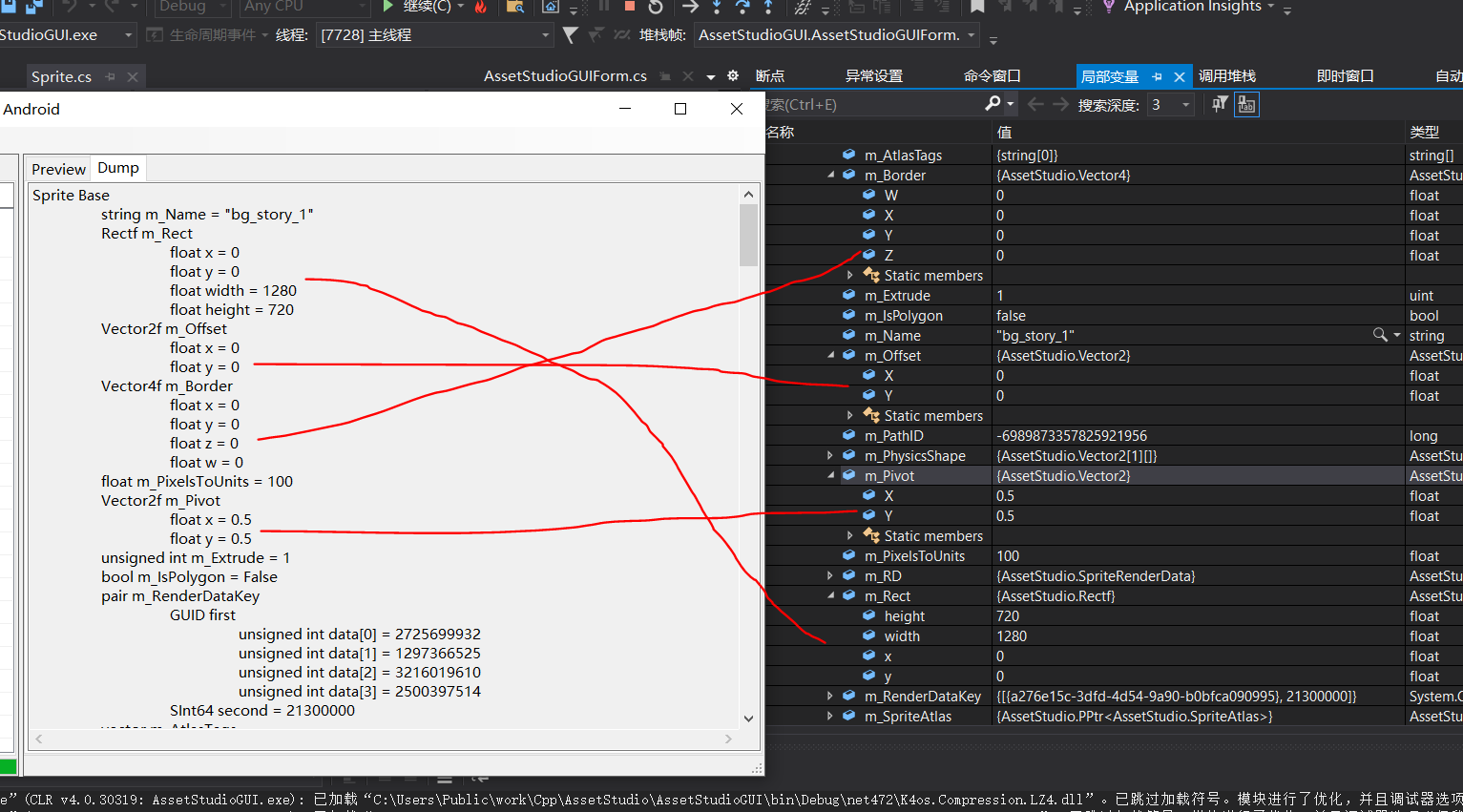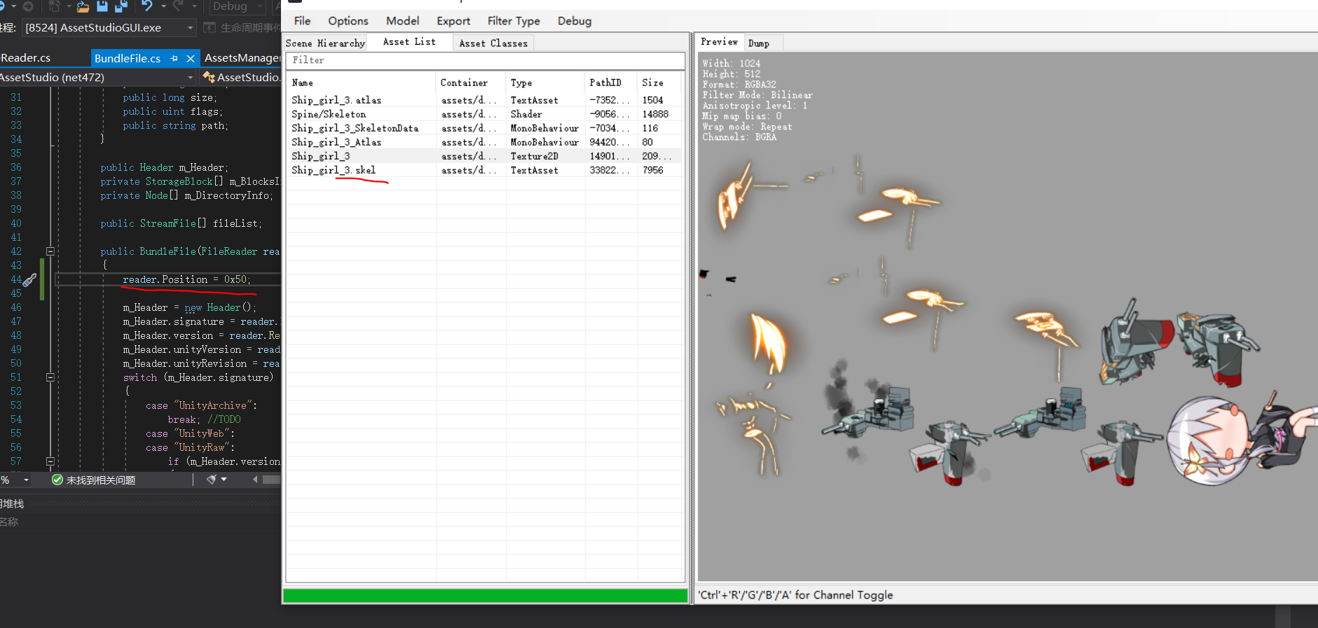 启动项是“AssetStudioGUI”,即此程序的主要界面,提供UI相关内容,“AssetStudio”是解析的主要部分,也是我们重点研究的对象,“AssetStudioFBXNative”和“AssetStudioFBXWrapper”提供fbx导出的功能,前者与sdk进行对接,后者完成C#部分的接口封装,“Texture2DDecoderNative”和“Texture2DDecoderWrapper”与前者类似用于纹理(即图片)的解析和导出,“AssetStudioUtility”提供丰富功能的工具类。