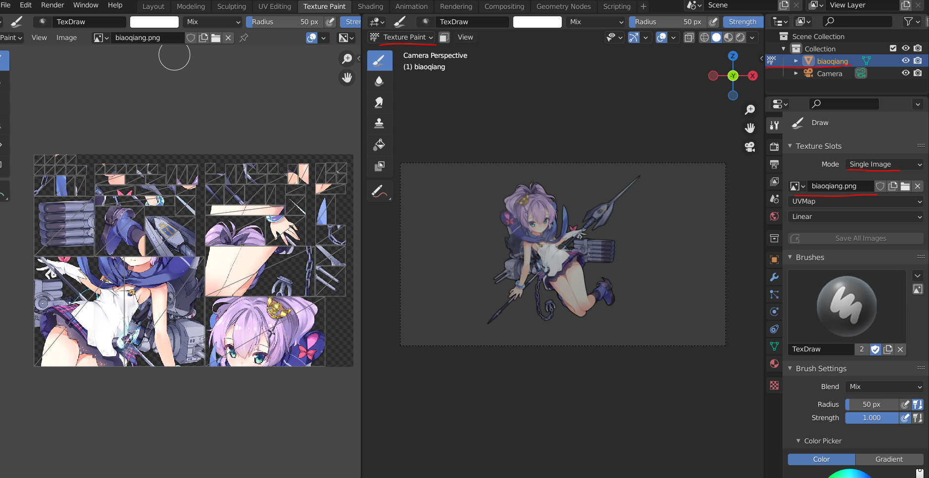 但是这样不仅繁琐,而且渲染结果跟shader(着色器)有很大的关系,实际上我们需要做的只是依据obj的数据进行图片拼接,这样还能保持图片本身的色调,其实现过程并不难,我们拿易用的Python来实现一下