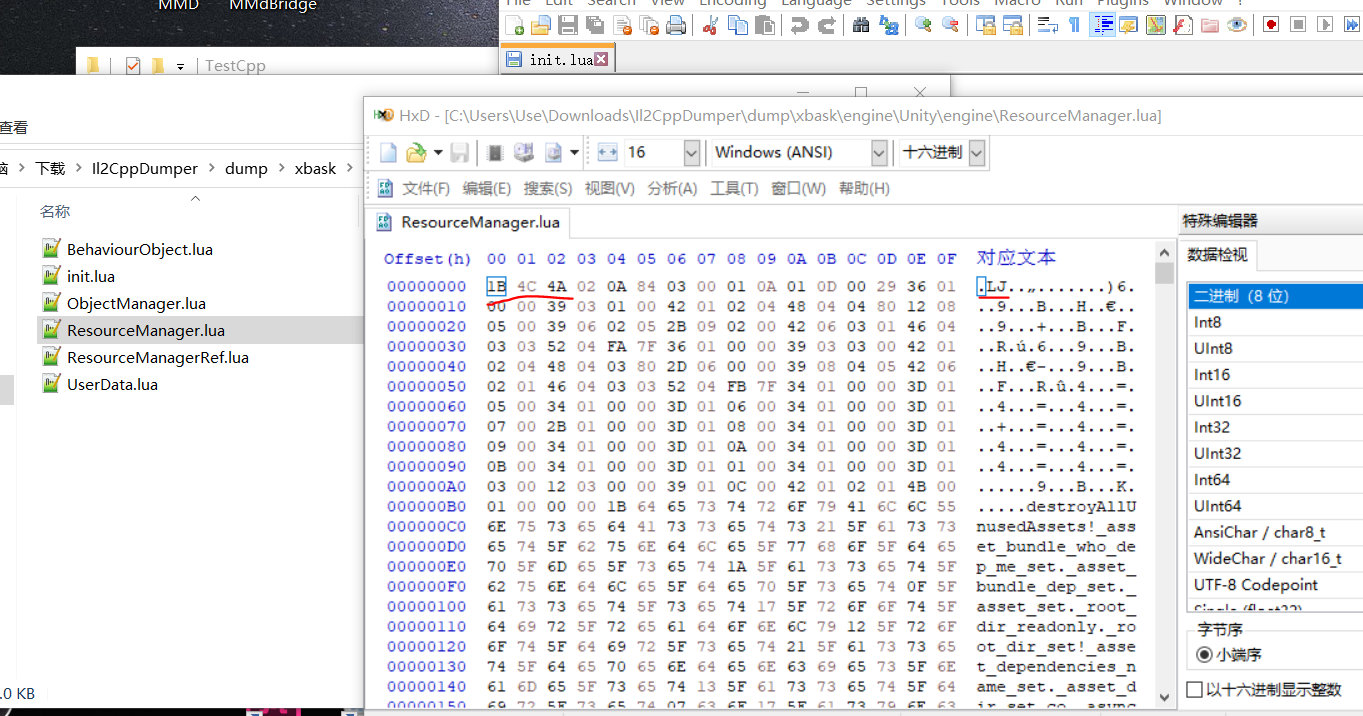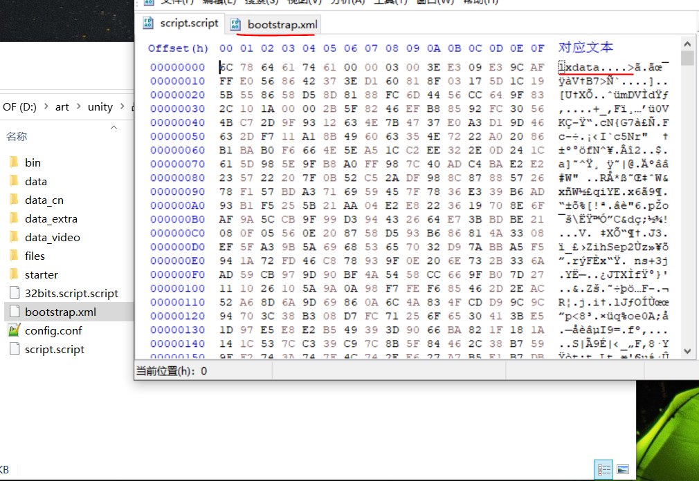 经过简易地浏览,可以得知,这个游戏总共有三种资源,.unity3d结尾的是AssetsBundle文件,是我们最终的目标,bootstrap.xml一种特殊加密的xml文件,最后一种就是lxdata文件,其中“config.conf”,“script.script”,“starter/xbask.core”虽然后缀不同,但在十六进制编辑器中可以看到,文件头都是一样的,通过百度谷歌等搜索引擎,找不到这种资源的任何信息,所以它是作者自己的加密方式,所以接下来的重心落在代码的分析上了。