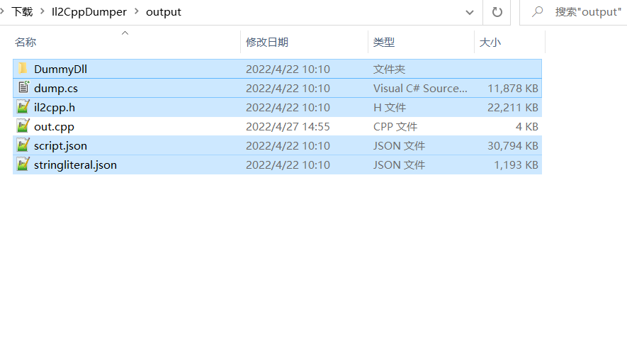 当然也不需要知道多,我们直接使用已有的工具Il2cppDumper。它的依靠.dat文件和so文件,来生成对照表,对于大部分情况基本无法生成运行逻辑,它会生成这些文件