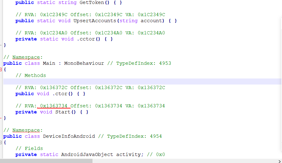 这是Unity最原生的资源打包,基本没办法加密,注意到两个Mono脚本,随便一猜就知道Main肯定是入口类。在“dump.cs”里面定位Main类,从而找到在动态库文件中的地址