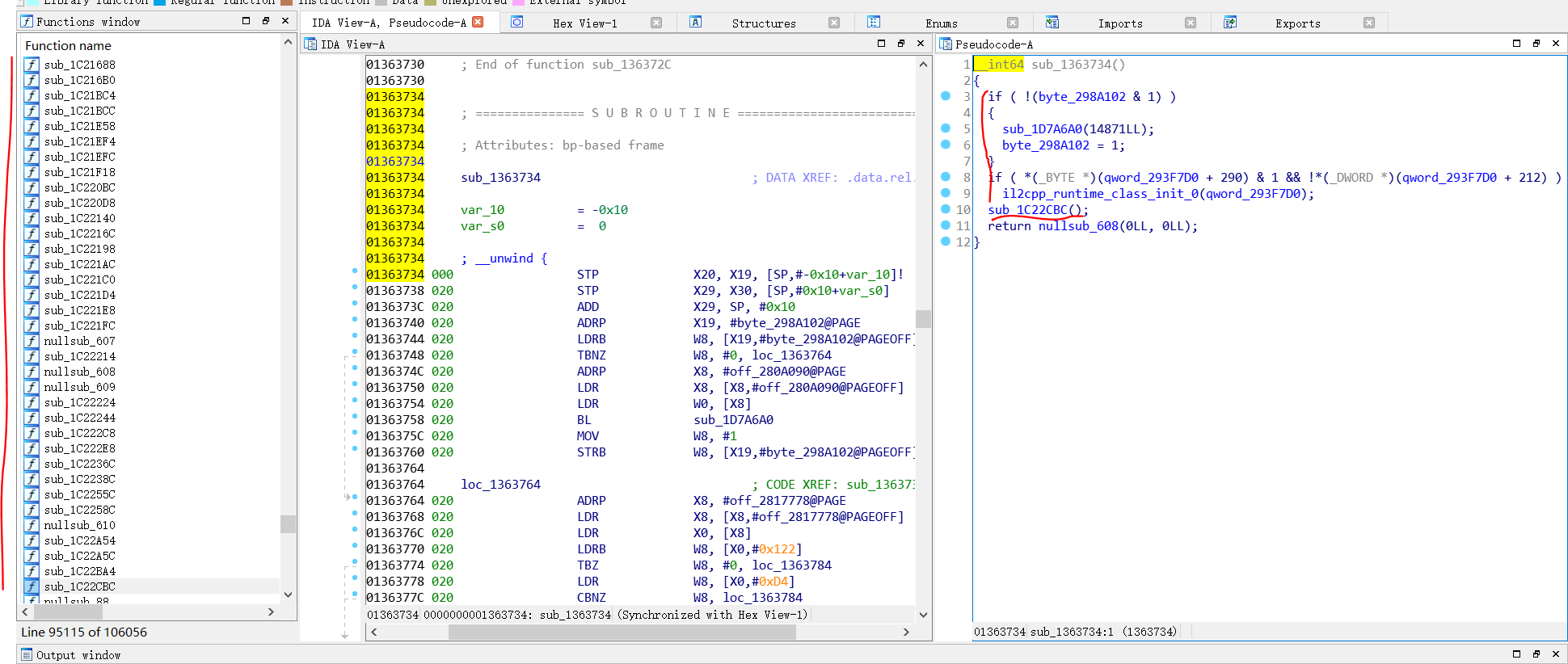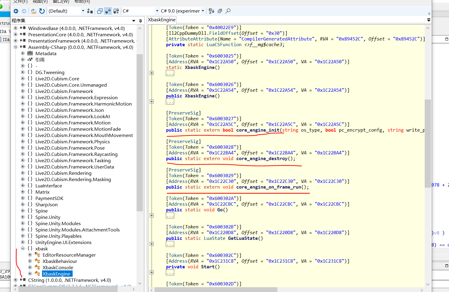 最右边是IDA生成的伪反编译代码,我们注意到有许多sub_×××形式的函数,这就是我们之前所说的由C#通过il2cpp转义来的函数,它们有一个特点就是一段加载过程,注意到右边的伪代码窗口,直到il2cpp_runtime_class_init_0之前的代码都是可以忽略的,它的逻辑来源于il2cpp,删去对理解的影响不大,以后会渐渐察觉到这点,然后就是下面的sub_1C22CBC()到底是什么函数,实际上sub后面的十六进制串就是函数的地址,我们可以通过“dump.cs”对照表找到这个函数
