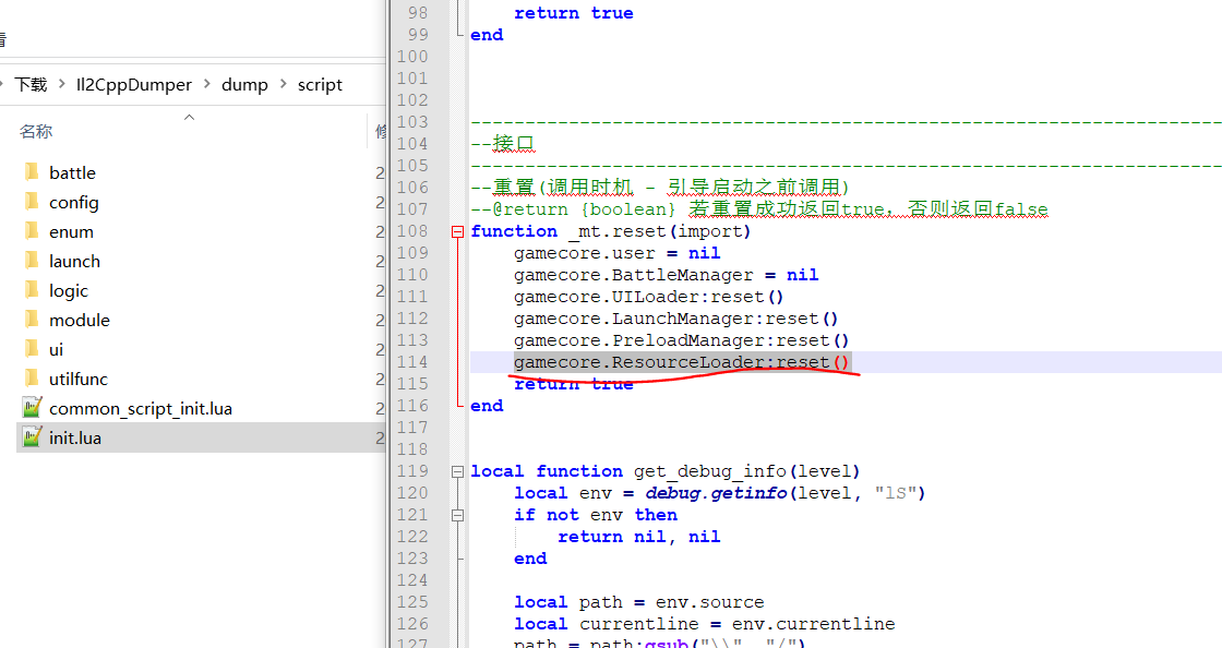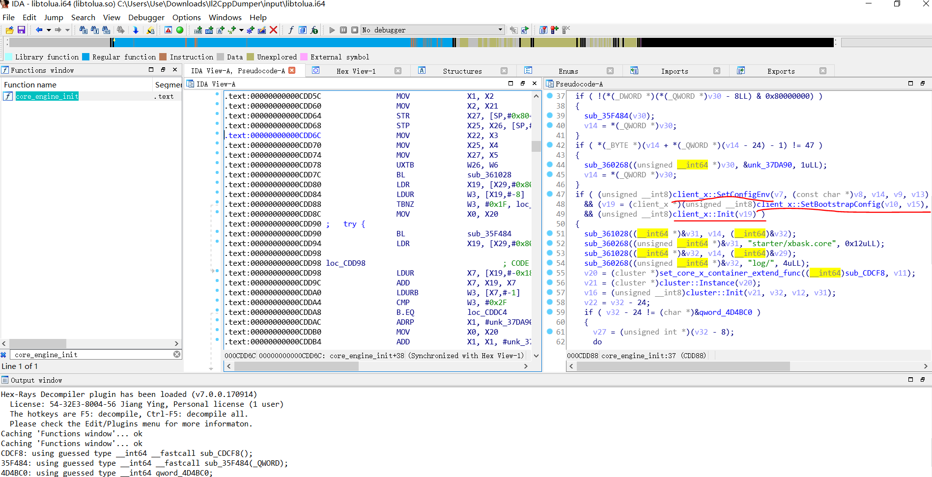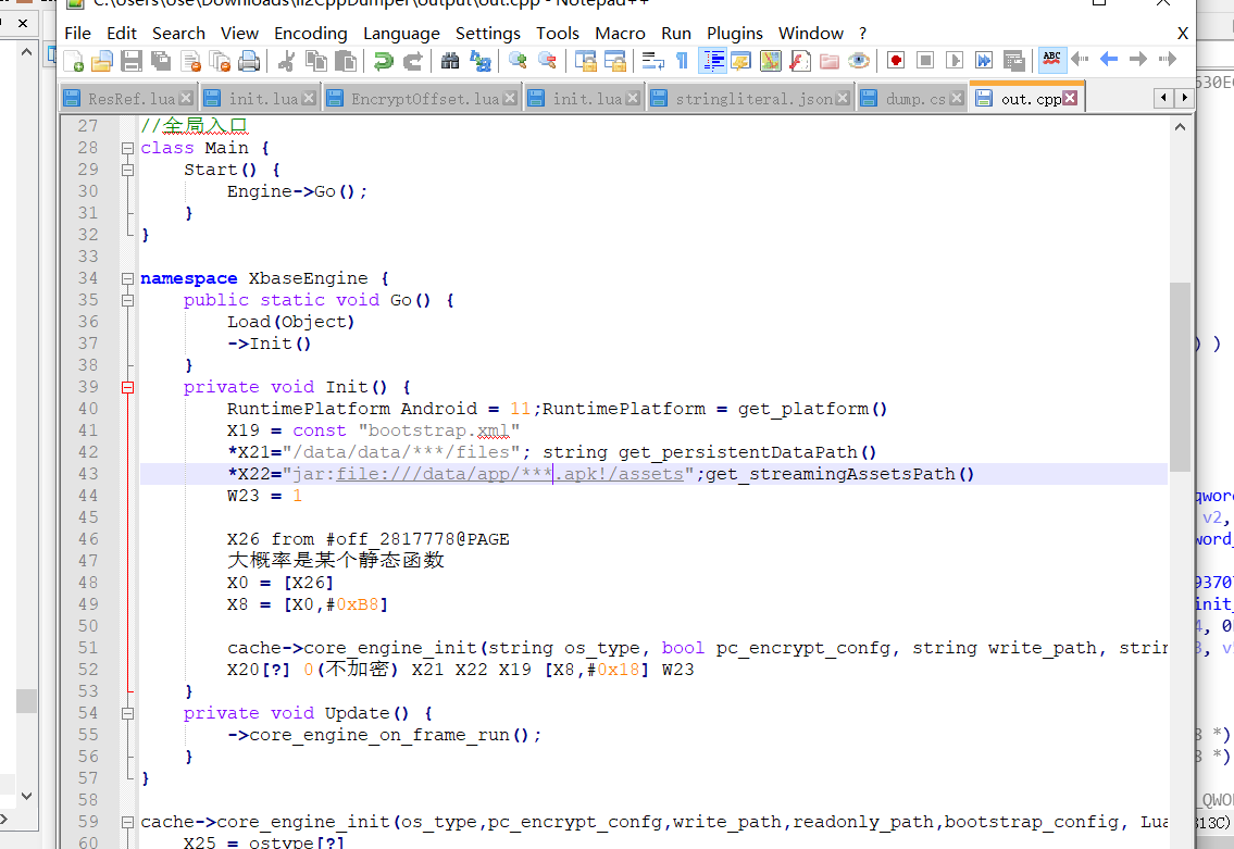 如果我们拿这个游戏的tolua和其它游戏对比,会发现它大了好多倍,也就是说里面实际有许多作者加进去的函数,因为这个库是由C系语言编译来的,所以我们可以用函数名定位到core_engine_init函数
