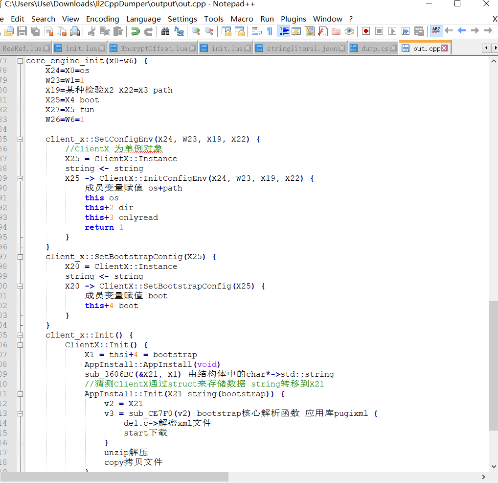 client_x是命名空间ClientX的代理层,实际上前者处于C层,后者处于C++层,真正的实现都在ClientX里实现,为什么要这么麻烦呢?其实C#与C++是比较难交互的,两种的类对象的底层实现并不相同,但C面向函数的特性可以从函数实现交接,而C++使用面向对象的特性就很好进行数据管理了,而且还能嵌入C代码,所以一劳永逸是划算的。在ClientX的InitConfig和SetBootstrapConfig内主要完成成员变量的赋值,在Init完成初始化的任务,但其是委托给AppInstall完成的,在AppInstall的Init里基本才是整个程序的核心,包括bootstrap解析,从云端下载数据,解析脚本等。至于为什么再来一个AppInstall,一种解释是分工越细越好,另一种解释应该是移植。通过对游戏历史的考证,其原来使用的引擎是cocos2dlua,在不知什么时候改成了Unity,这可能吗?确实有可能,因为游戏的脚本全是用lua写的,而AppInstall实际就是cocos2dlua那里移植过来的残留,目的很简单就是为了实现游戏的热更新。由于剔除了cocos2d的引擎内核,ClientX实际相当于模拟cocos2d调用AppInstall的过程,当然这样并不够还有游戏内核接口的绑定,好在这个游戏公司在lua层加了一个xbask引擎,所以移植的时候只要将xbask的接口通过tolua#重新绑定到Unity内核函数即可,当然这还是得归功于lua函数的动态绑定机制。