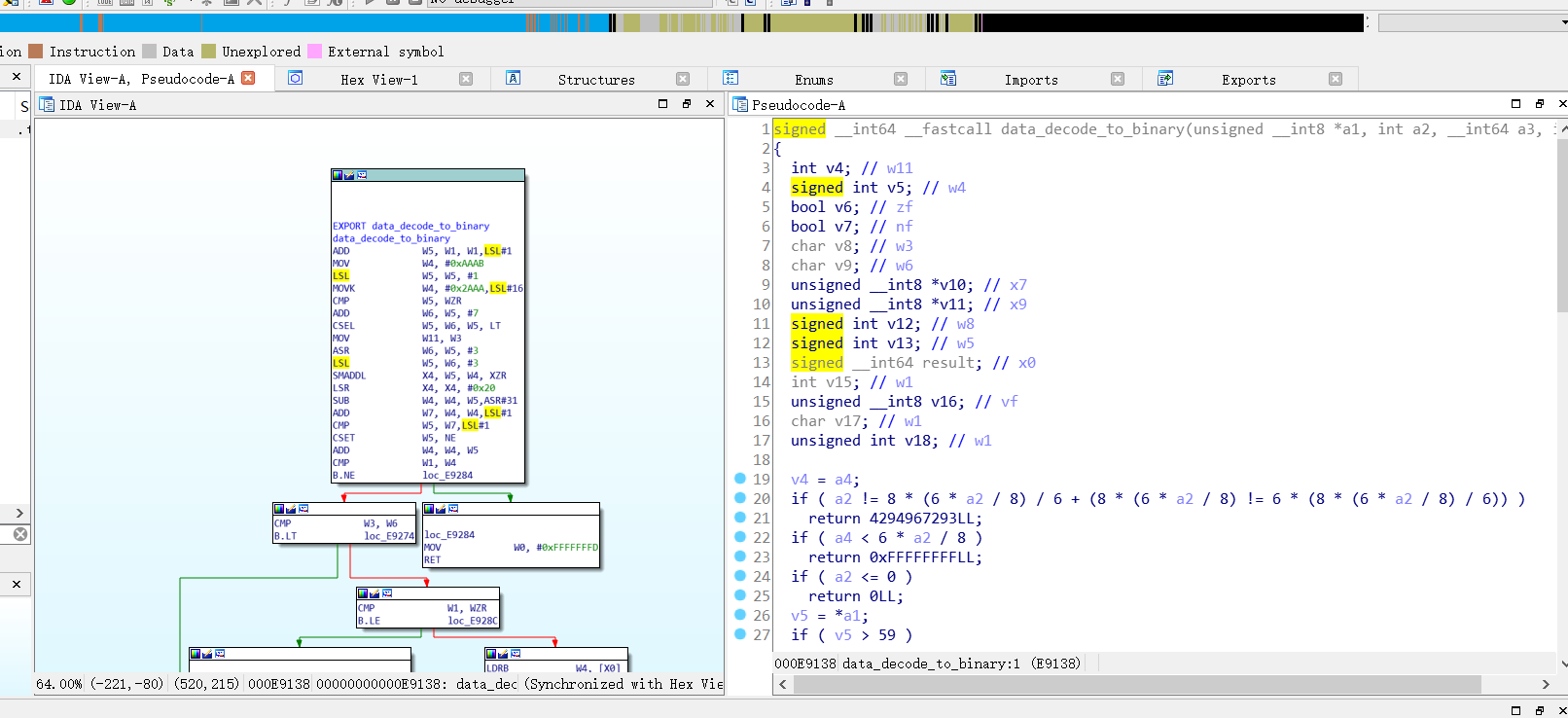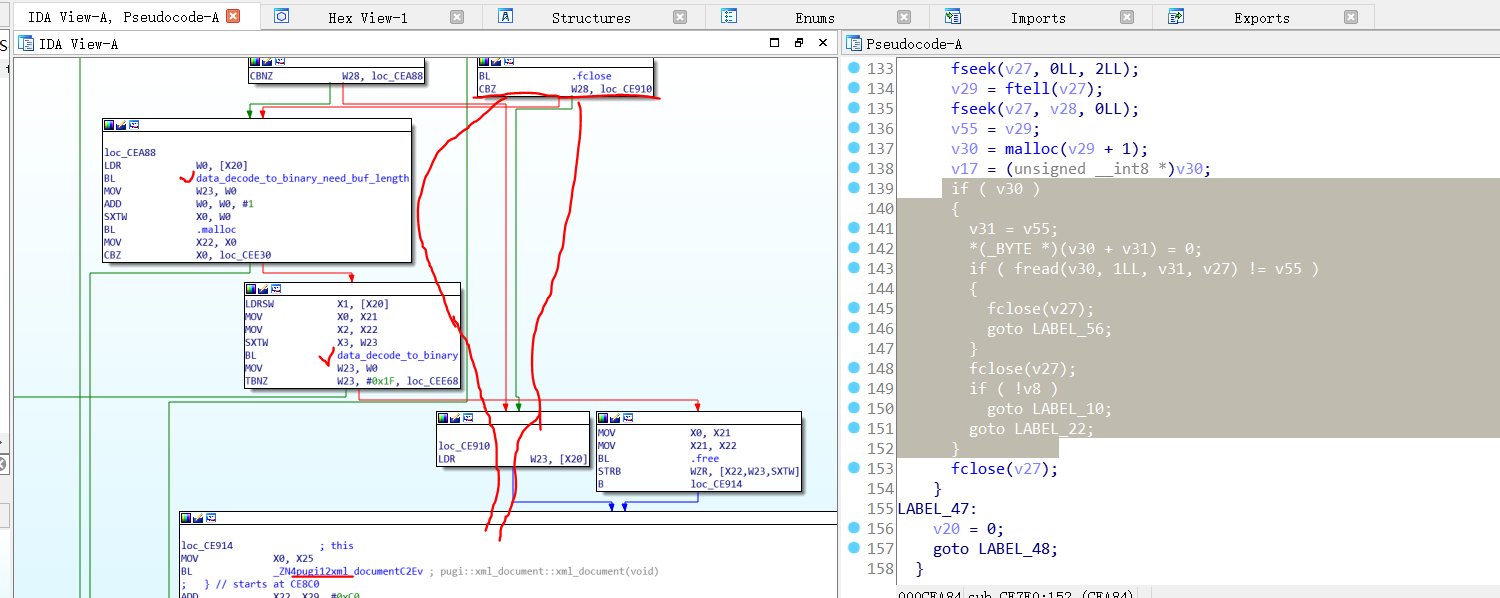 通过流程图可以知道,在fclose后即数据已经载入内存,会更具寄存器W28的值判断是否直接进入pugixml,W28的值是我们传入的第二个参数pc_encrypt_config,从具体文件和静态分析都表明它是true,所以data_decode_to_binary就是解密的核心函数,至于前面那个,是用于获取需要多少内存的,为原内存的3/4,至于pugixml则是解析xml的C库