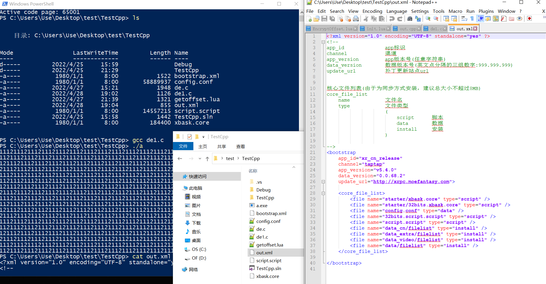 问题出现在文件末进行getc的时候,这实际是我们所给的列表文件的问题,不是很严重就懒得管了,一番努力之后,我们把三个lxdata全部解包完成,config包含一系列json的配置文件,script是整个游戏的核心lua代码,xbask是处于lua的中间层,目的是隔离lua和内核方便代码迁移,然后接下来就简单了。