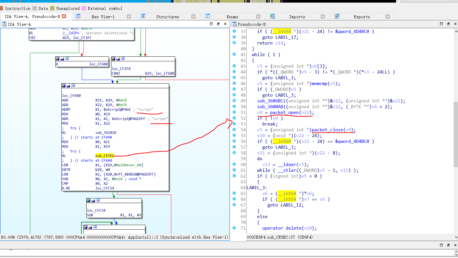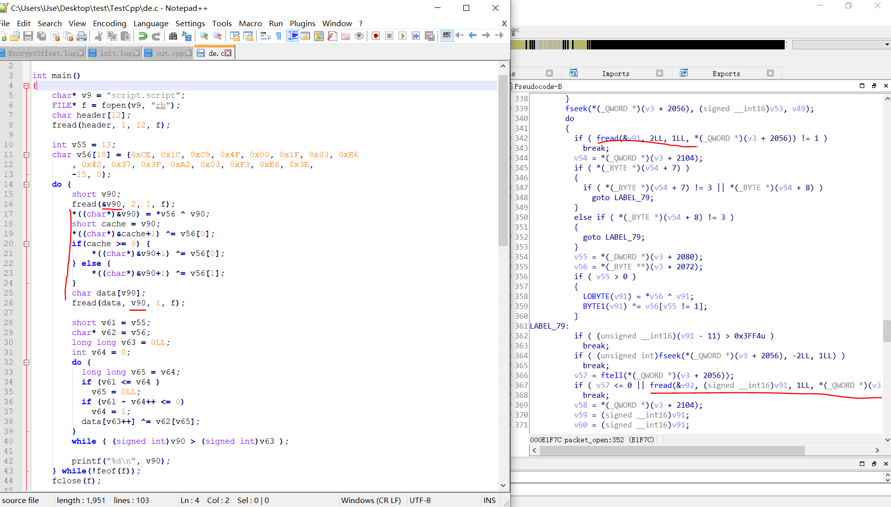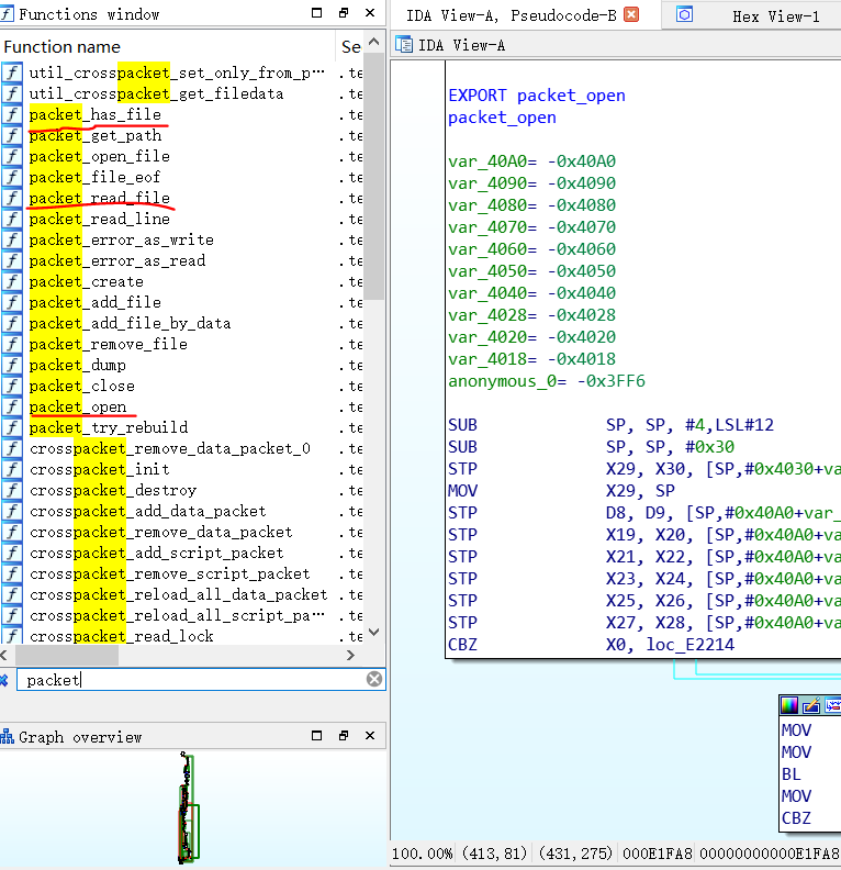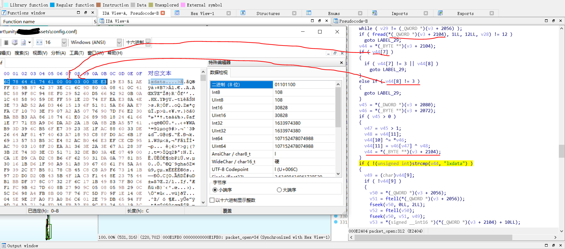 通过对库文件的分析,我们需要三个函数,packet_open打开lxdata包,并返回packet结构体,packet_open_file打开packet中的某快文件并返回长度,packet_read_file读取packet中被open的文件。你问我为什么会知道这些?一个是通过函数名,最开始看到packet_read_file就感觉是我们需要的函数,但仔细分析参数和伪代码可以发现