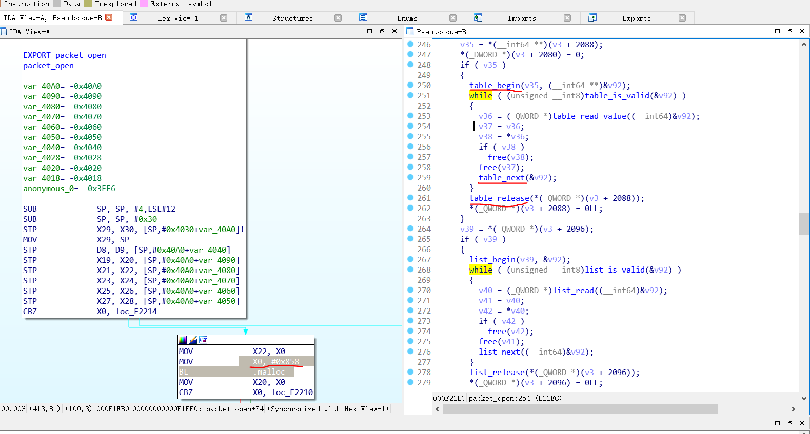 虽然数据确实一块块的提取出来了,但并不是我们想要的,想要通过伪代码推出packet和table结构体的结构有些困难,而数据又是动态处于内存中的,相应通过文件保持下来实在太困难了。但是方法总比困难多,接下来请欣赏一种另辟蹊径的方法。