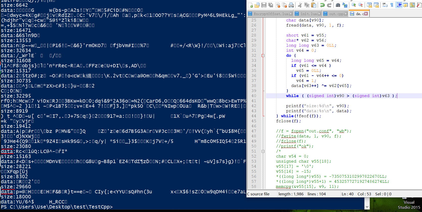 在后续的分析中,我们发现了最开始分配的那2136字节并作为返回值的内存块的意义。它其实应该是一个结构体编译来的,用来保持解析packet后的数据的引用,解析后的数据应该存在一个可能叫table的结构体中,而packet则是在此基础上再封装一些包的其它信息,那么lxdata是什么呢?其实它大概是table结构体的序列化数据,注意这都是猜测,因为编译后本身就会丢失很多源码的信息,比如C里面的结构体直接翻译为内存块,而寻址基本是编译时期,编译器就把完成了。那么难点在哪呢?我们仿照着伪代码进行读取解密代码的编写,运行后只能得到这些