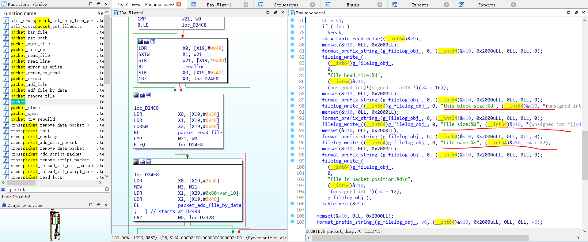 结果真的找到了,还告诉了你该怎么用,packet_open_file有两个参数,第一个是packet结构体,第二个是需要取出文件的名称,然后返回文件当然大小,接着以这个大小分配一块内存调用packet_read_file即可读出数据。但我们还有一个问题,packet内文件的名称都是什么?这个算是无意间发现的,笔者没有思路的时候,随便看了看其它函数,发现了packet_dump的特别之处