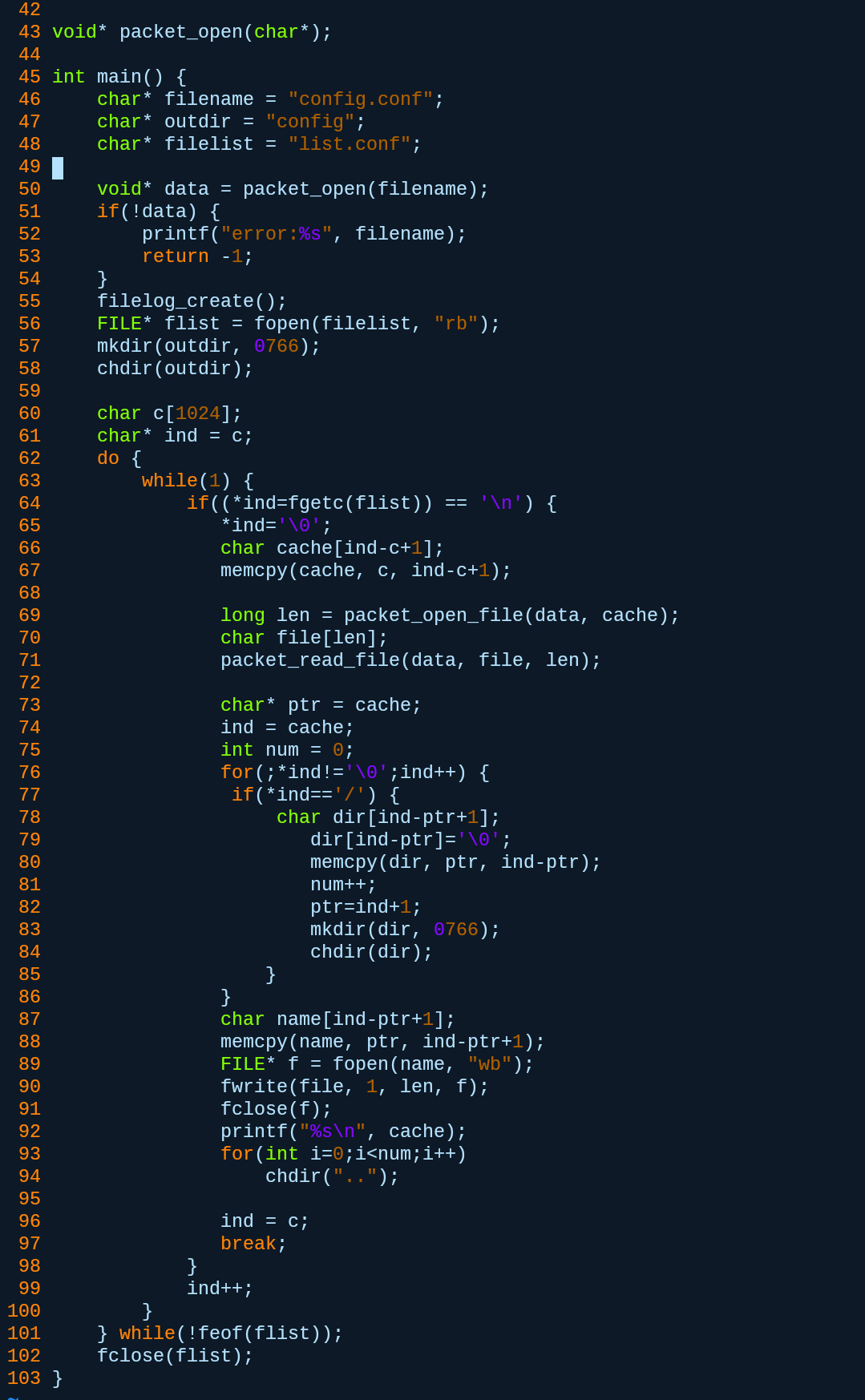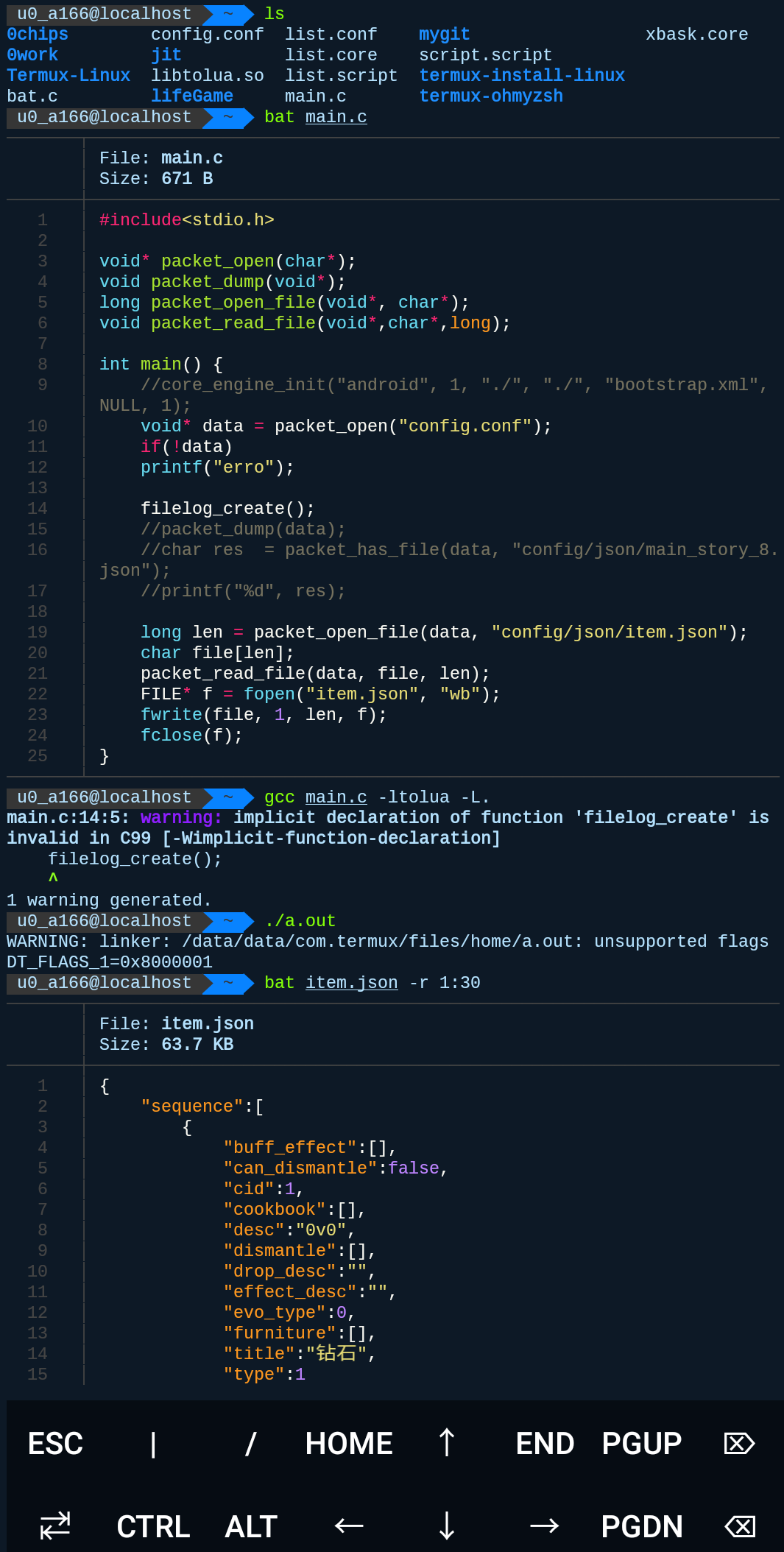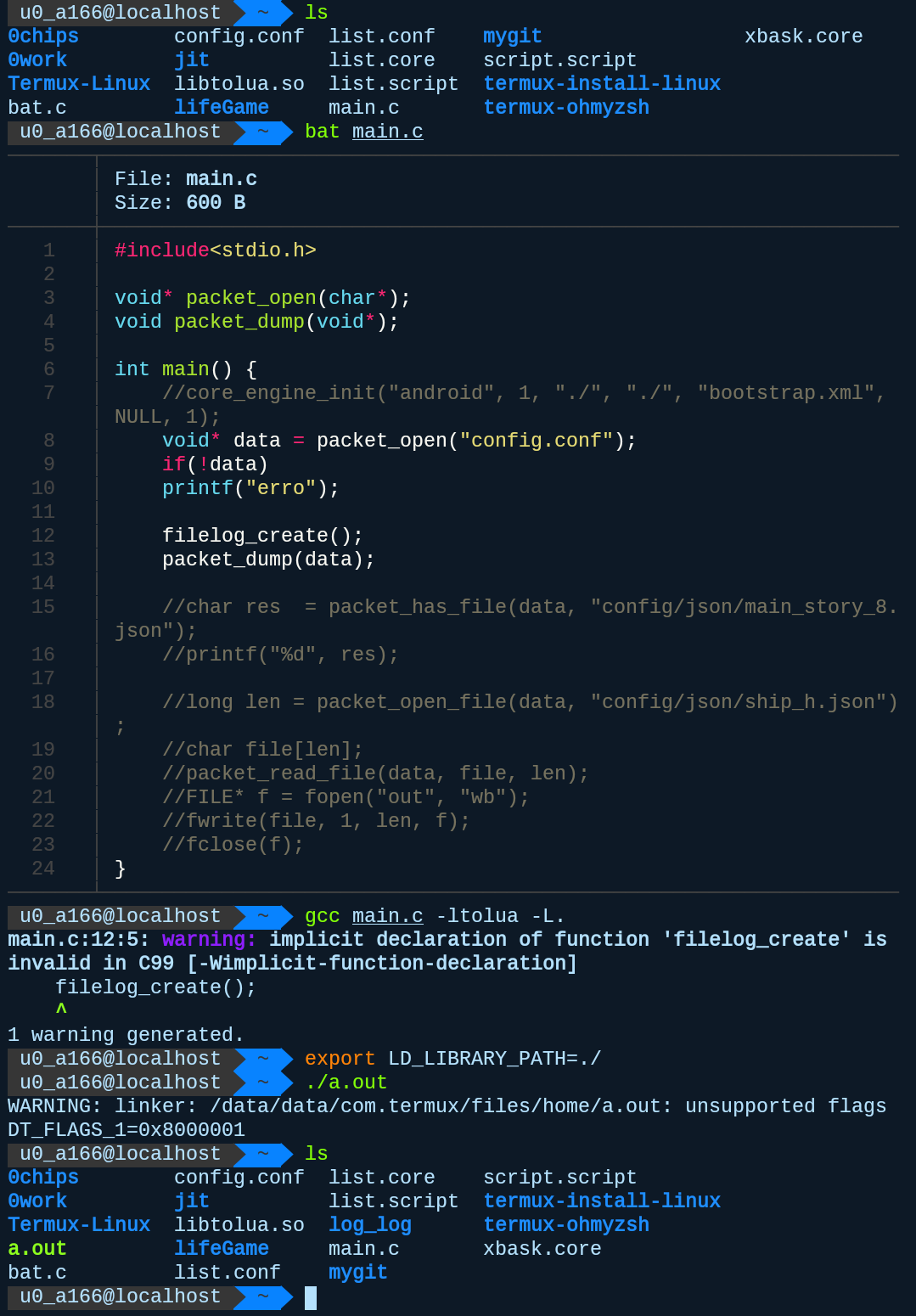 这是一个日志输出的函数,传入packet结构体可以把包的信息都打印出来,好家伙,正愁找不到文件名,它就直接打算给我,这算是一个小小的漏洞吧。好了,函数理解的差不多了,接下来该开始实践代码,由于库文件是arm架构的,而电脑是x86架构,所以我们只能在手机上编译运行,使用我们的神器Termux