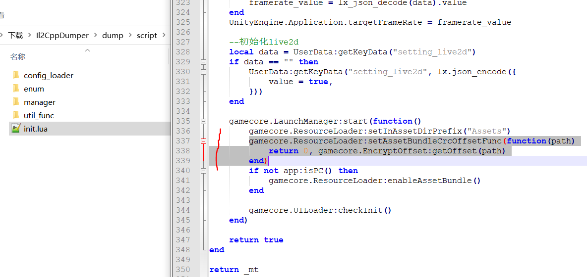 在资源加载中调用了get_asset_bundle_crc_offset函数,顾名思义获得资源文件的冗余偏移,而且其结果将作为资源文件加载的参数。经过考察,这个函数是ResourceLoader的成员变量,其设置函数在script的init里可以找到