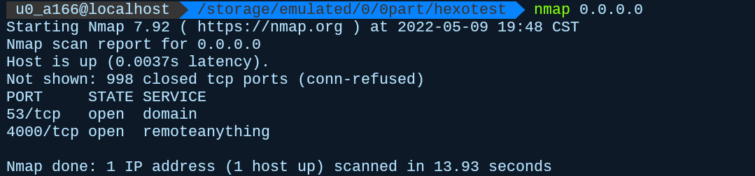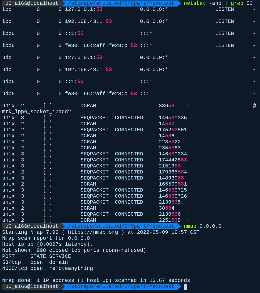 实际打开了53端口,在公网下,这是用于dns域名解析服务器的端口。而在wifi内网下,用于与所连设备建立通信,再来看一个现象