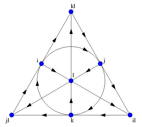 类似的,我们还可以得到八元数o=x₀+x₁i+x₂j+x₃k+x₄l+x₅il+x₆jl+x₇kl,x₋都是实数,il,jl,kl都是与i,j,k,l无符号关系的记号(当然也可以用其它的,只要能区分就好了),其运算性质可由Fano(法诺)平面来记忆