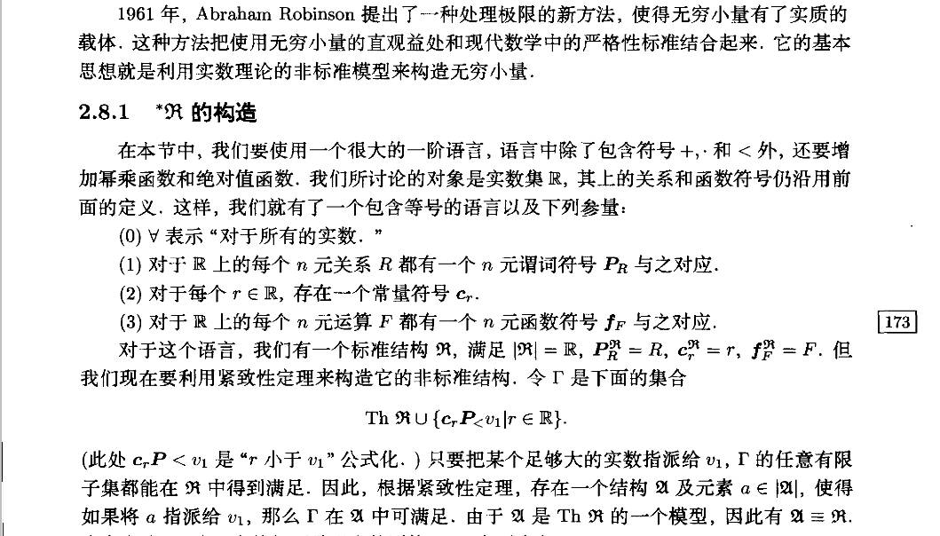 里面的话都比较抽象,我来稍微说一下。一阶语言即我们平常所用的到逻辑语言,这此基础上添加相关公理,即可得到不同的一阶理论,比如添加皮亚诺公理形成一阶算术,而一阶实数传统认为要求完备有序域,“域”就是抽象代数里的那套公理,“有序”即表示顺序那套公理,而“完备”则要靠引入分析的语言来实现,其意思就是所有的柯西列都是收敛的。如果去出完备公理,有理数和实数都满足剩下的公理,即都是有序域公理的模型。也就是说,我们是为了引入实数而需要分析,而不是在实数之上建立分析,这种思考所带来的就是那套ε-δ语言。