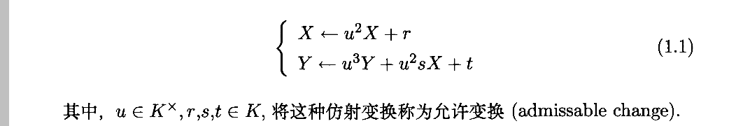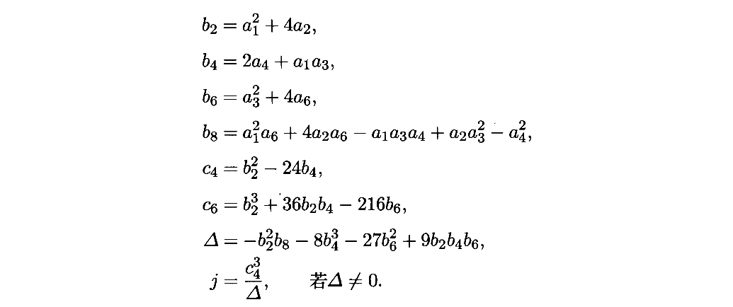 过程并不难,第一步对y进行配方即可,此时出现2,所以只有域的特征大于2才能进行,第二步则是解三次方程常用的一步消二次项的方法,会出现3,所以只有域的特征大于3才能进行,有时为了方便讨论,我们将上述方程转化为下面的形式