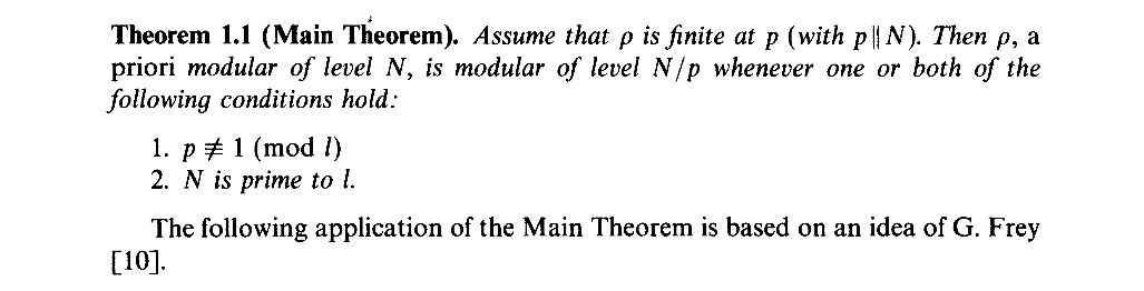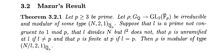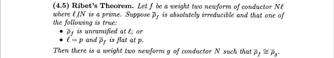从现代表述和Ribet论文中的表述,我们可以看出实际上它与Ribet定理的主要区别不在非分歧和平坦上(本质都是有限),而在于p与N的关系,但你会发现Mazur的要求之一也有p是N的一次素因子,换言之Ribet定理实际包含了Mazur的结论。这里就要提一下Ribet实际证明了什么,即下面的定理