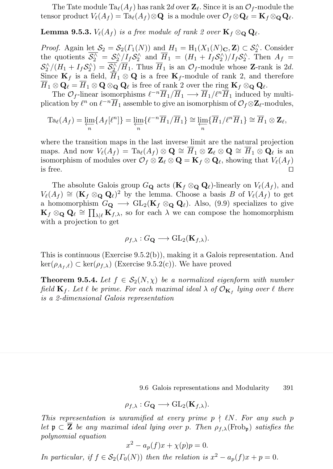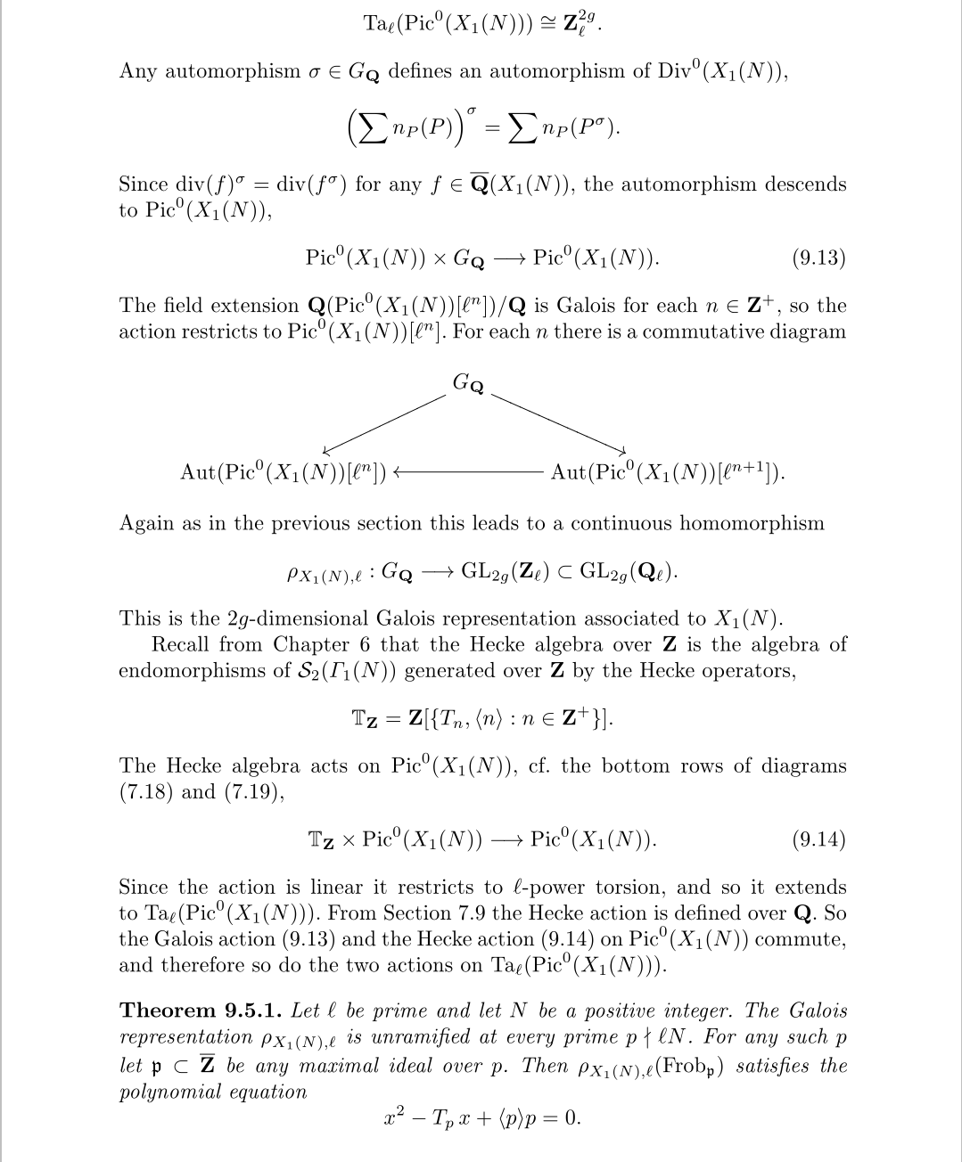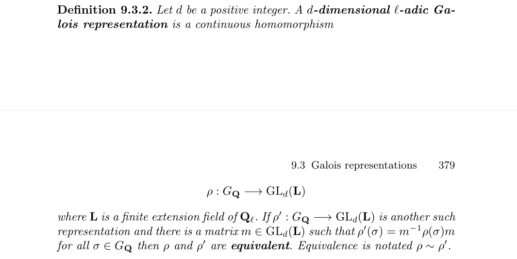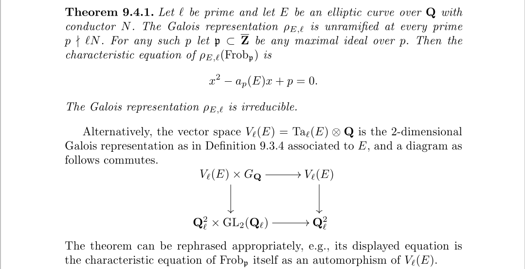 值得注意的是模曲线的表示,指的实际是模曲线上雅可比簇的表示,学过复流形的应该知道紧黎曼曲面是可以嵌入到它自己的雅可比簇中的,雅可比簇是一个g维复环面,所以定义类似的p进Tate模也是简简单单。需要考虑的还有添加扭点的Galois性,当然这里每个分量的Galois性,你觉得它对就行了,而且很久前面的探讨也大概能感受到这些。另一个觉得怪异的点是,方程的系数为啥是算子?上面其实也讲得挺清楚的,原始的几个Hecke算子可以成一个环,它们构成的Hecke代数可以视为雅可比簇(或皮卡群)上的变化,它可以视为一个Z模,它可以与原始的Hecke算子建立对应关系,所以将表示视为群到Hecke代数的映射是可以的。更进一步,我们可以得到想要的存在即阿贝尔簇的情况
