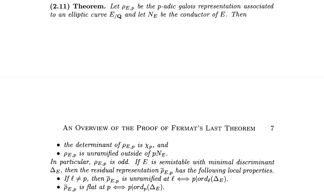 注意到上面推论2.8(c)的“for all but finitely e”,意思是不可约剩余表示有有限个特例,再看下面的定理2.9(b),所以对于半稳定曲线特例可以出现在2,3,5,7的地方。一下子把上面的两个情况都驳倒了,质疑是件好事,说明你确实在思考,也说明自己还有什么东西没有理解到位。而对于费马大定理实际可以用下面2.9(c)的更强结论,p=2时方程有解,对应的表示是平凡的,所以大于3的素数的剩余表示都是不可约的。接下来,我的学生再也找不到反例了,于是我宣告了胜利,费马大定理证明完成。