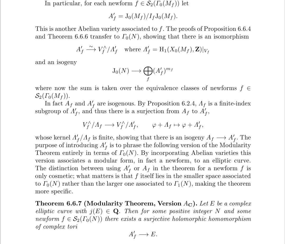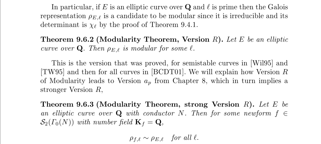 里面说明了要选有理新形式,因为只有这样我们才能得到一个一维复环面。至此,我们终于可以给出证明费马大定理的一个重要中间定理,模性定理,的一个严格表述了