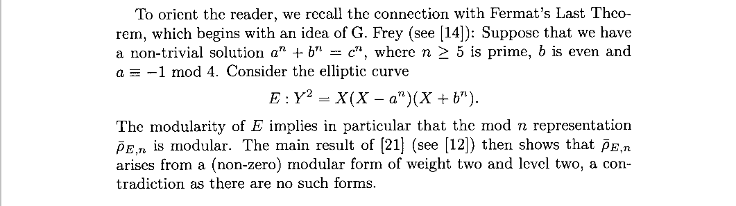 怀尔斯只证明了模性定理的半稳定情况,最后还是由它的学生泰勒完善了其中的错误,但也无法掩盖怀尔斯是最大的功臣,仅仅是因为它将费马大定理的证明做了结尾吗?要知道其中的许多过程都是必要的,比如Eichler–Shimura, Langlands和Deligne从模形式构造椭圆曲线的过程,它使得模性定理走向定量化;还有Tate的p进表示构造和有限平坦群簇理论,它给出来由特定环面导出表示的过程并结合代数几何给出非分歧,平坦等基本概念,从而使得模性定理的研究转向了群表示理论;接着是Serre和Frey详细地研究了各种椭圆曲线上的代数和表示,并且发现Frey曲线与一般的椭圆曲线有些奇妙的不同;然后是Mazur和Ribet对剩余表示的约化提供了理论基础,为后面的Frey曲线的矛盾引出提供了方法,使得Frey曲线也可以用“无穷下降的方式”引出矛盾;最后是Wiles证明了模性定理的半稳定情形,为费马大定理的证明划上了圆满的句号。这个领域还有许多东西,我的旅途还未结束,让我们继续前进吧。