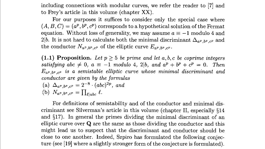 并且要求a≡3(mod 4)和2|b(即b为偶数)。对这个曲线我们的疑惑应该有很多,令y=0此时曲线是关于x的三次方程,最开始我们要对方程形成一个共识,a,b,c要么相同都是0,要么一个为0另外两个为相反数,要么互不相同,从方程的对称性也是可以发觉的,这表明了如果费马大定理成立的话,曲线右边关于x的方程只有一个三阶零点0,反之费马大定理不成立的话,应该存在非零的a或b或c使得曲线右边关于x的方程没有重根。a,b,c互相对称选谁都是无所谓的,重要的是下面的两个约束条件,其目的实际是为了a,b,c区分出来。由于方程的右边为0,因此a,b,c要么都是偶数,要么一个偶数两个奇数,对于前一种情况,可以通过提取偶数部分的公因子化为后一种情况,而且这两个奇数必需一个mod4余1一个mod4余3,a,b,c谁占据这三个位置(mod4余3,偶数,mod4余1)都可以,而我们要求如上面所示。Frey曲线的一个精妙之处是去除