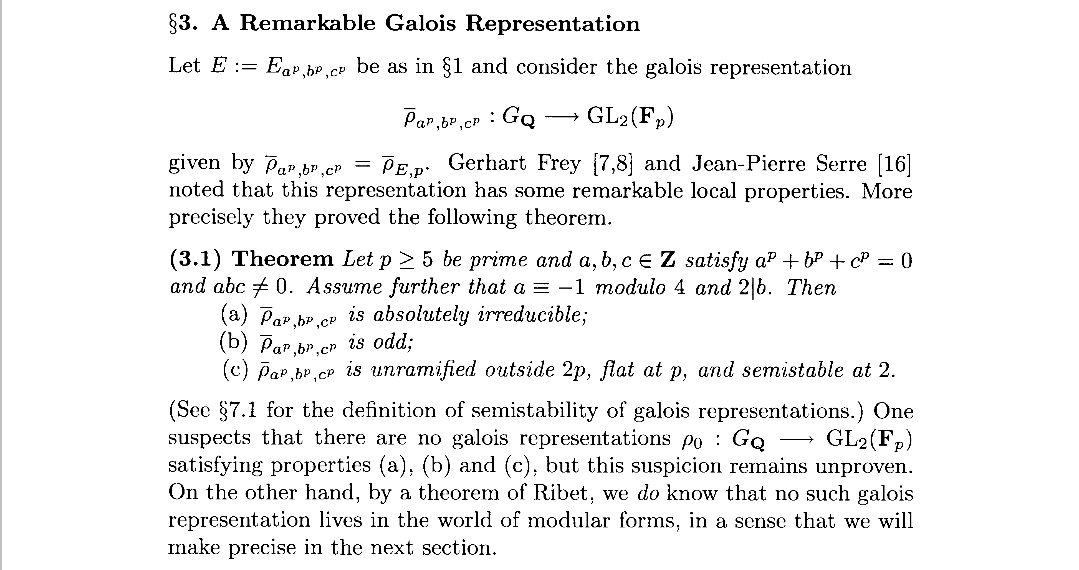 首先Frey曲线是条半稳定曲线,这其实挺重要的,虽然模性定理对所有椭圆曲线都成了,但半稳定意味着它的导子没有平方因子,由于b是偶数,所以Frey曲线的导子包含了2,至此也看不出Frey曲线有什么奇怪的地方。依据模性定理,我们可以得到一个Frey曲线导出的表示,