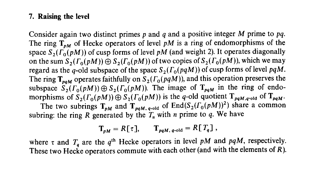 Ribet实际完成的是一个次数向上的工作,而新产生的这个q又正好满足Mazur结论中的要求,应用Mazur的结论最后才得到了我们的Ribet定理。也就是说Ribet的证明+Mazur的结论综合起来才得到了现代的Ribet定理。考察Ribet论文的核心部分,它先是在“Raising the level”部分证明了升次的定理