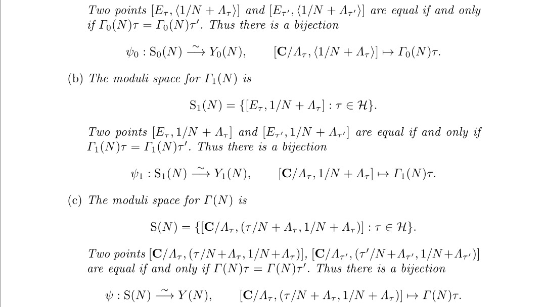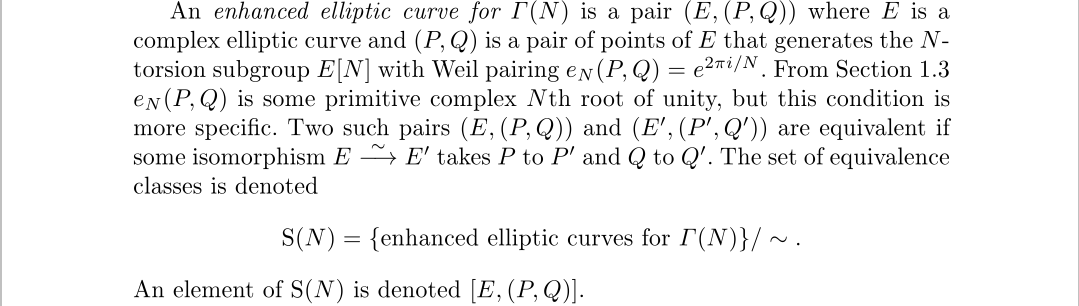这里选择了两个不相关的N阶N扭点,这其实是个很好的巧合,N扭点正好有N×N,我们就会觉得N扭点似乎是二维的,所有能正好选出两个点来,也正因如果,我们不会在有三个扭点的情况了,目前已经不知如何该继续加限制了。这正好对应了同余子群Γ(N)不能再小了,但请理解这个“不能再小”的意思不是说没有子群了因为Γ(kN)就是它的子群,也就是说“不能再小”的意思是