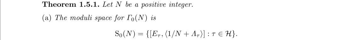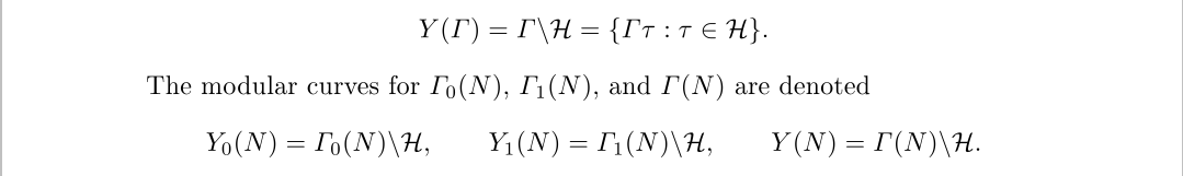 上半平面H关于同余子群Γ的等价类集合,我们记为Y(Γ),可以验证它是一个黎曼曲面,但并不够,我们需要紧黎曼曲面,方法也很简单,把Γ的等价尖点加进去就行了。我们可以直接从相关的结论得到尖点,我们定义Q∪{∞}在Γ下等价类的集合为Γ的尖点,这不是原始的定义,但这是合理的定义,其实不知道太多也无所谓,只要知道这样做以后形成的曲面记为X(Γ)并且它是一个紧黎曼曲面。比如完全模群