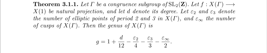 当我们赋予模函数加法和数乘时,容易发现,模函数空间有封闭性,还能构成复数域C上的一个线性空间。所以我们自然对其维数和标准正交基感兴趣,因为这样我们就能摸清整个函数空间,并且通过基来生成所有的模函数。首先是维数,通过对模曲线的分析可以得到下面的公式