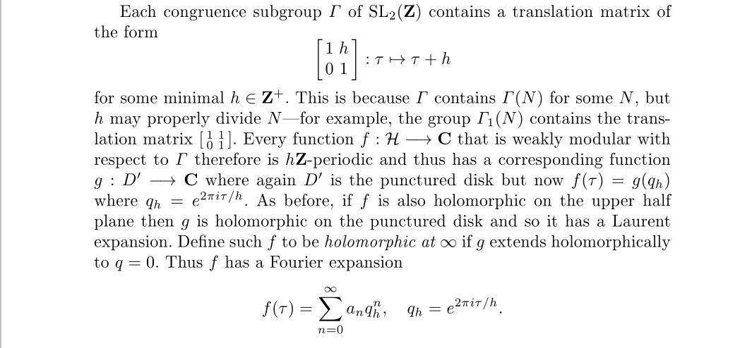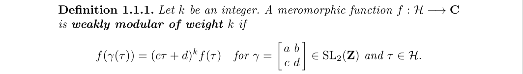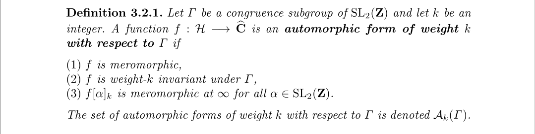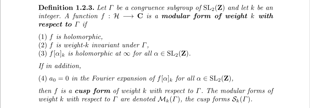 我们发现傅里叶展开经过一个指数函数后,其实相当于对应点的洛朗级数,不过嘛,根据延拓的相关原理,将上半平面的函数扩展到整个平面也不是不可能,所以有个展开也不是稀奇的事。至于最后一部分,将傅里叶展开没有常数项的模形式称为尖形式,没啥好说的,要求而已。然后再来一个自守形式的定义