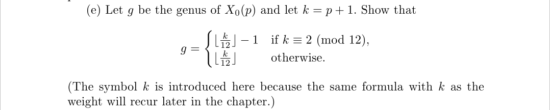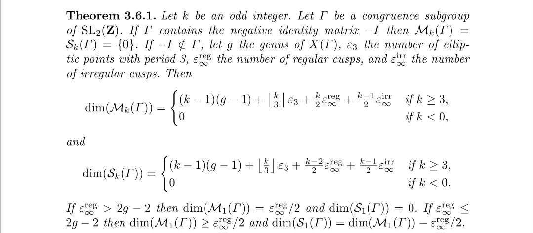 这里偶数和奇数是分开讨论的,还是那句话看不懂不用紧,只要知道维数确实是可以计算出来的就行了。我们接下来用到的其实只要一个,即权为2的尖形式空间的维数等于亏格。