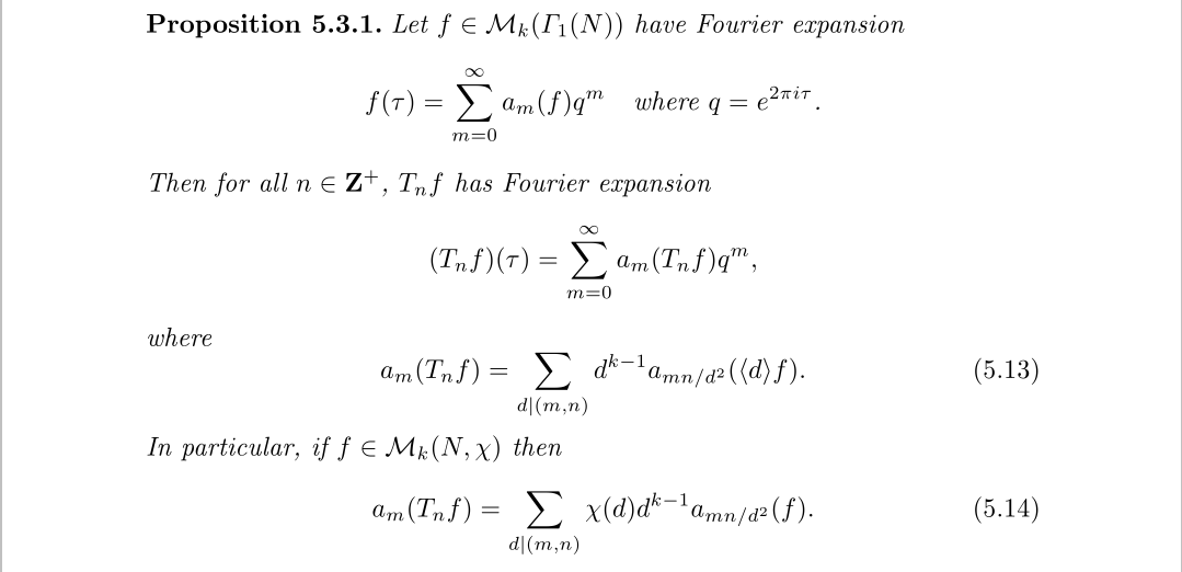 算子的数乘与加法,可以看成函数的加法和数乘与算子运算交换次序,而算子的乘法则视为算子作为映射时的复合映射,这都泛函分析的常规操作,就不深入说明了。我们知道模形式可以完全由傅里叶展开系数来确定,于是考虑这些算子都傅里叶展开系数展开系数的影响是足够的