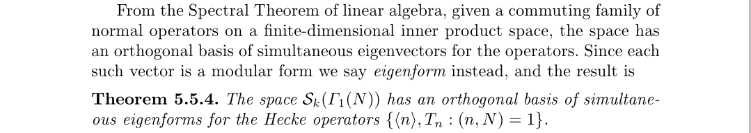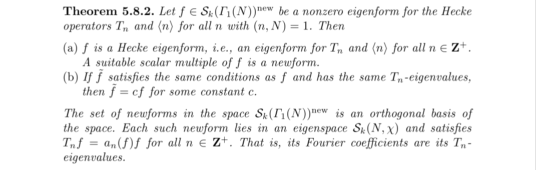这里面有几个值得注意的点,首先是同时特征形式,即我们的基函数必需同时是所有Hecke算子的特征向量,而且这个特征算子还要剔除一些情况,只能选取互素的情况,这是为什么呢?实际上,当一个函数是