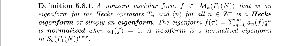 顺便我们还把它的补空间视为新形式空间,值得注意的是补空间的定义依赖于内积,内积只有在尖形式下才能有比较好的定义,所以讨论新旧形式都必需在尖形式空间下。接着我们可以给出特征形式的严格定义