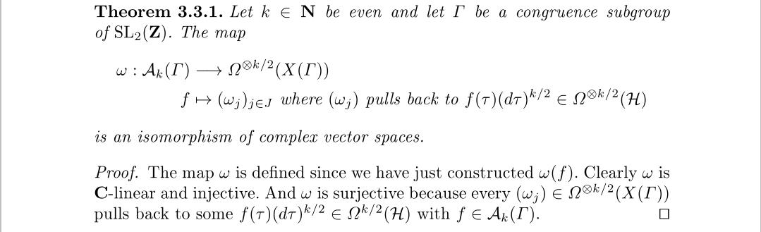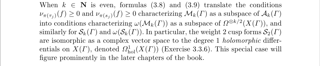 比较有意思的是,模曲线上的全纯形式,对应的是权为2的尖形式,而不是模形式,这是为什么呢?最开始我们要清楚一点,这并不是因为模形式空间和尖形式空间可以对应,有时它们的维数都不一样,模曲线上的全纯形式要求在所有局部坐标下形式不变,我们在构造模曲线的时候基本用的都是恒等映射,唯一特别的坐标是椭圆点处的情况,它使用了二次和三次函数,以这个情况去考虑的话,大概就知道原因了,对于我们的概论而言知道是这么一回事就行了。